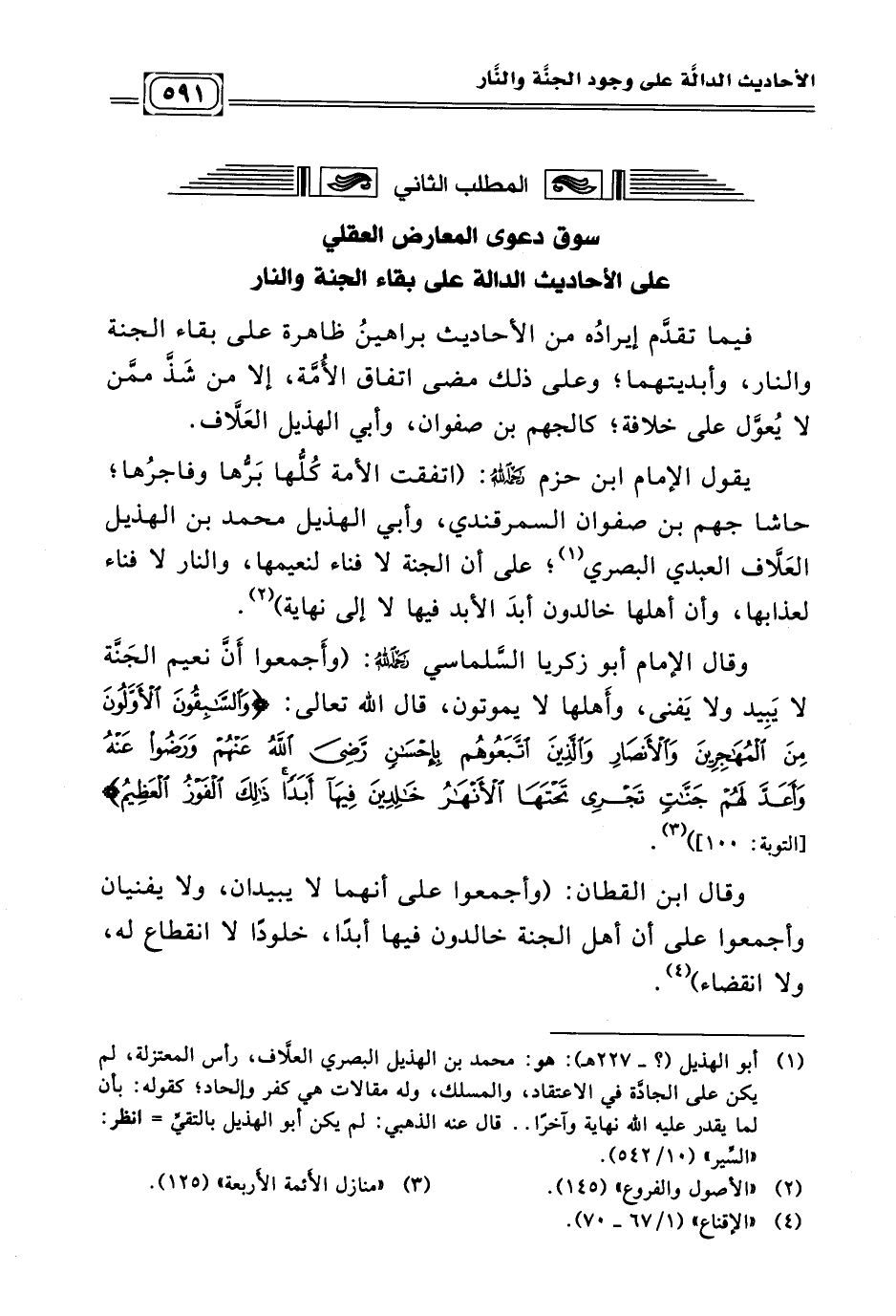 يقول الإمام ابن حزم - رحمه الله -: (اتفقت الأمة كُلّها بَرُّها وفاجرُها؛ حاشا جهم بن صفوان السمرقندي , وأبي الهذيل محمد بن الهذيل العَلاّف العبدي البصري؛ على أن الجنة لا فناء لنعيمها، والنار لا فناء لعذابها، وأن أهلها خالدون أبدَ الأبد فيها لا إلى نهاية) (¬١).