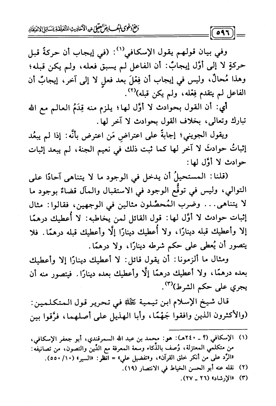 (¬١) الإسكافي (؟ -٢٤٠ هـ):هو محمد بن عبدالله السمرقندي، أبو جعفر الإسكافي، من متكلمي المعتزلة وصف بالذَّكاء وسعة المعرفة مع الدِّين والتصون، من تصانيفه:"الرَّد على من أنكر خلق القرآن"،و"تفضيل علي"=انظر:"السير" (١٠/ ٥٥٠) .