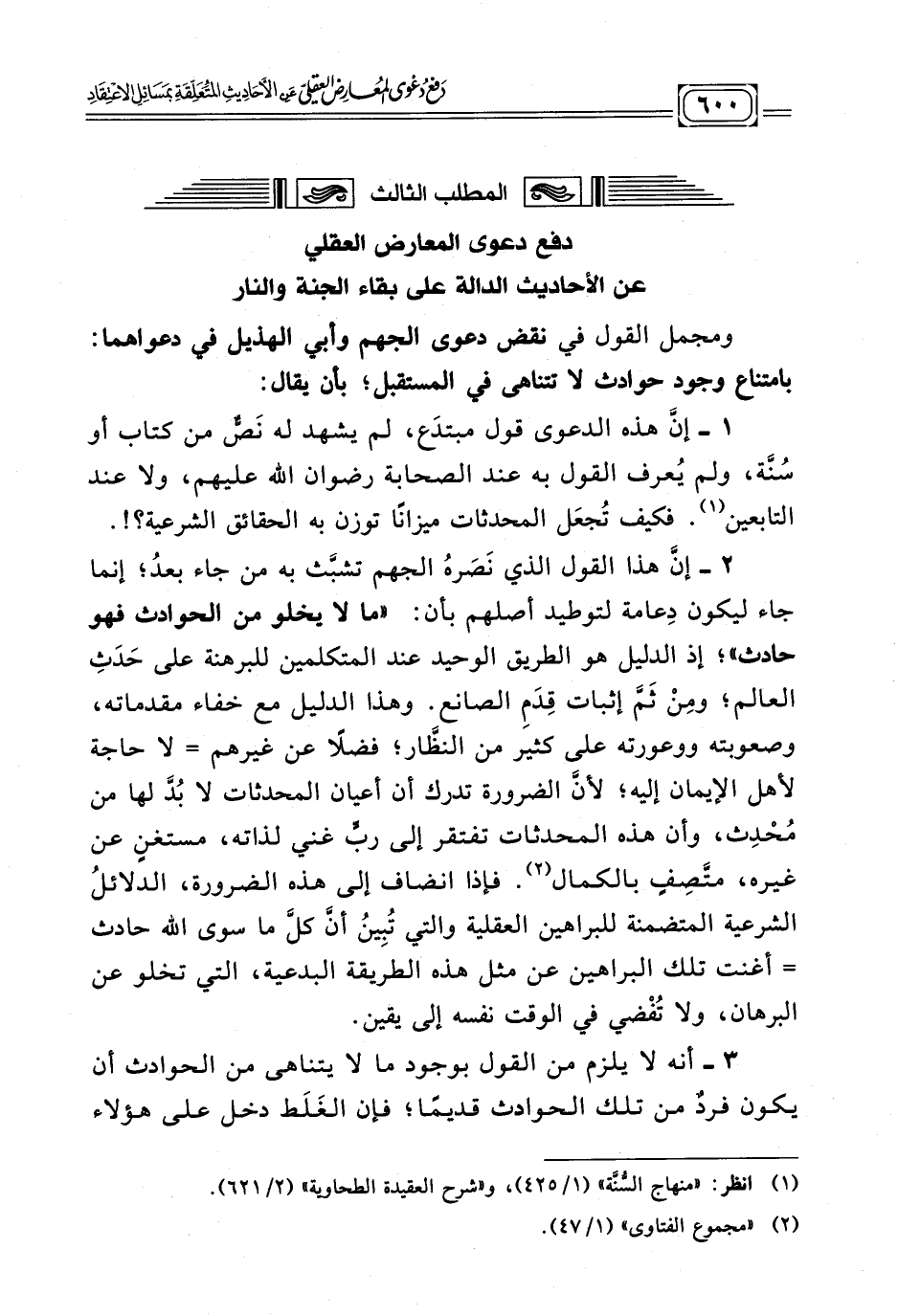 المطلب الثالث: دفع دعوى المعارض العقلي عن الأحاديث الدالة على بقاء الجنة والنار: