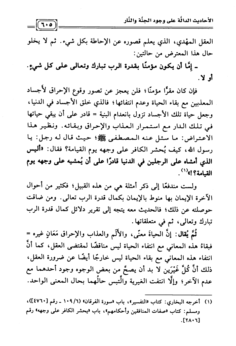 فإن كان مقرًّا مؤمنًا؛ فلن يعجز عن تصور وقوع الإحراق لأَجساد المعذبين مع بقاء الحياة وعدم انتفائها؛ فالذي خلق الأجساد في الدنيا، وجعل حياة تلك الأجساد تزول بانعدام البنية = قادر على أن يبقي حياتها في تلك الدار مع استمرار العذاب والإحراق وبقائه. ونظير هذا الاعتراض: ما سئل عنه المصطفى - صلى الله عليه وسلم -؛ حيث قال له رجل: يا رسول الله , كيف يُحشر الكافر على وجهه يوم القيامة؟ فقال: (أليس الذي أمشاه على الرجلين في الدنيا قادرًا على أن يُمشيه على وجهه يوم القيامة؟!) (¬١) .