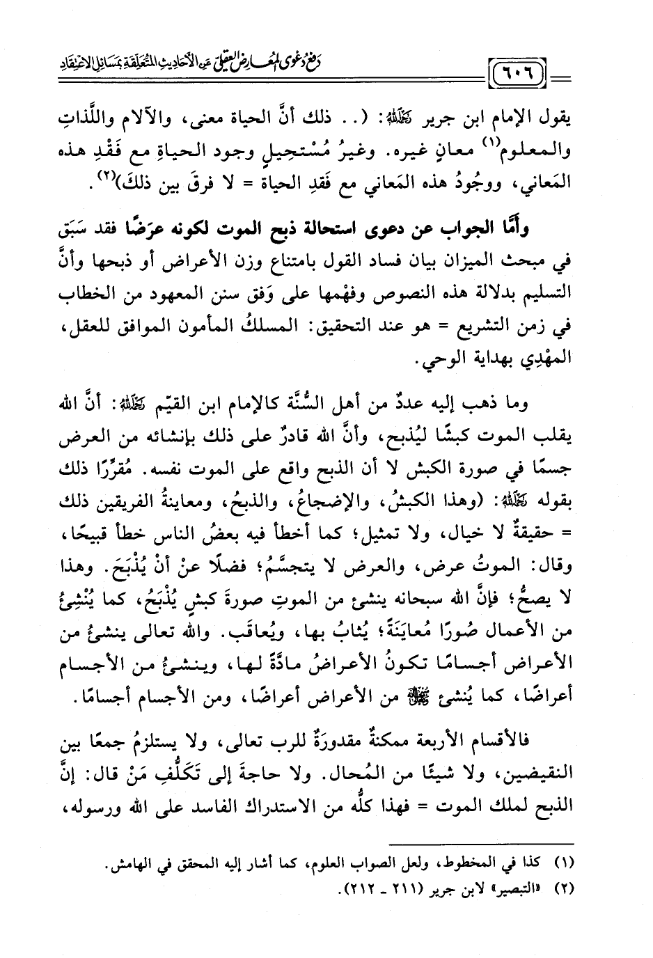 وأَمَّا الجواب عن دعوى استحالة ذبح الموت لكونه عرَضًا فقد سَبَق في مبحث الميزان بيان فساد القول بامتناع وزن الأعراض أو ذبحها وأنّ التسليم بدلالة هذه النصوص وفهْمها على وفق سنن المعهود من الخطاب في زمن التشريع = هو عند التحقيق المسلكُ المأمون الموافق للعقل، المهْدِي بهداية الوحي.