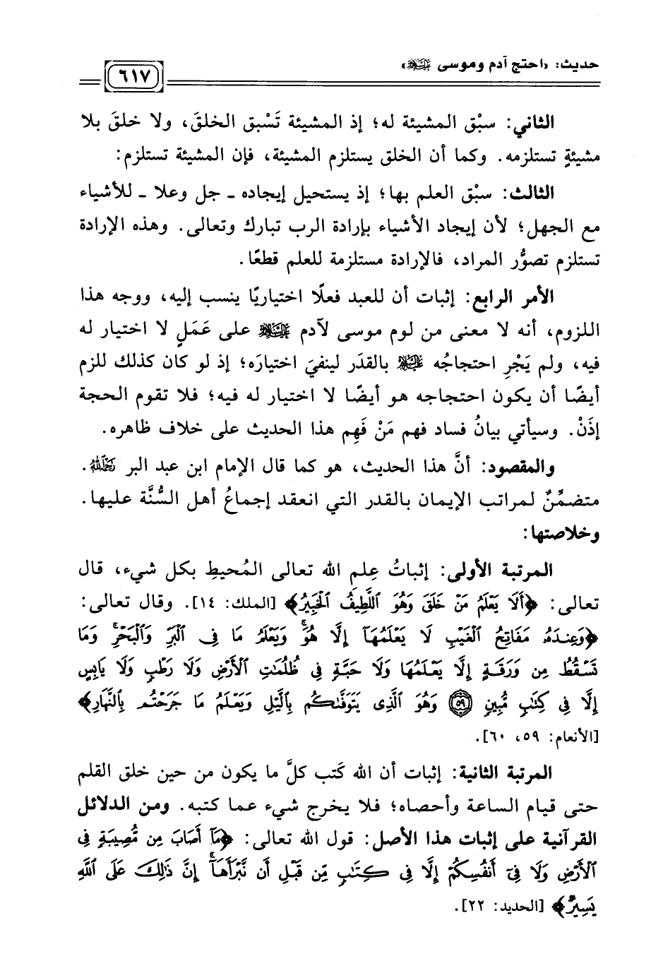 الأمر الرابع: إثبات أن للعبد فعلًا اختياريًا ينسب إليه، ووجه هذا اللزوم، أنه لا معنى من لوم موسى لآدم عليهما السلام على عَمَلٍ لا اختيار له فيه، ولم يَجْرِ احتجاجه عليه السلام بالقدَر لينفي اختياره؛ إذ لو كان كذلك للزم أيضًا أن يكون احتجاجه هو أيضًا لا اختيار له فيه؛ فلا تقوم الحجة إذَنْ. وسيأتي بيان فساد من فَهِم هذا الحديث على خلاف ظاهره.