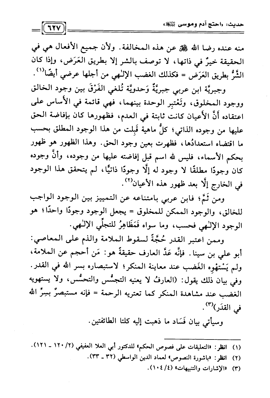 وممن اعتبر القدر حُجّةً لسقوط الملامة والذم على المعاصي: أبو علي ابن سينا. فإنّه عَدَّ العارف حقيقةً هو: مَن أحجم عن الملامة، ولم يَسْتهْوِه الغَضب عند معاينة المنكر؛ لاستبصاره بسر الله في القدر. وفي بيان ذلك يقول: (العارفُ لا يعنيه التجسُّس والتحسُّس، ولا يستهويه الغضب عند مشاهدة المنكر كما تعتريه الرحمة = فإنه مستبصرٌ بسِرِّ الله في القدَر) (¬٣) .