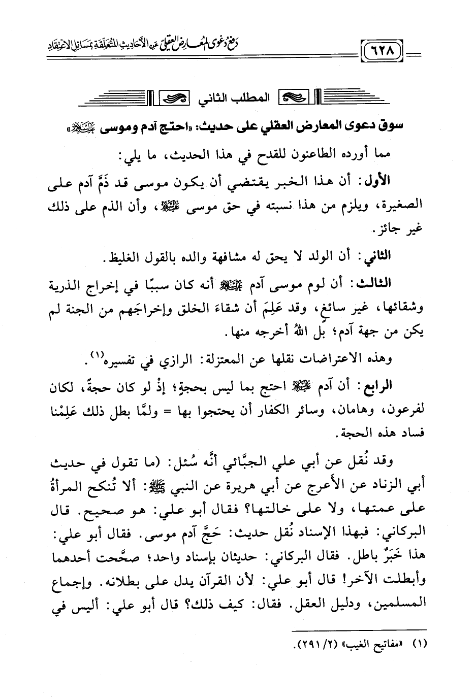 المطلب الثاني: سوق دعوى المعارض العقلي على حديث: (احتج آدم وموسى عليهما السلام).