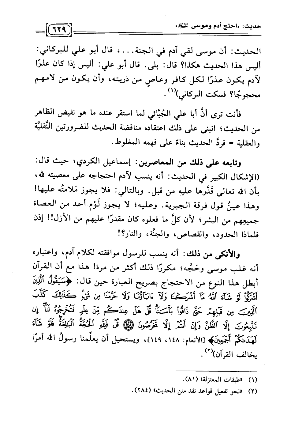 والأنكى من ذلك: أنه ينسب للرسول موافقته لكلام آدم، واعتباره أنه غلب موسى وحَجَّه؛ مكررًا ذلك أكثر من مرة! هذا مع أن القرآن أبطل هذا النوع من الاحتجاج بصريح العبارة حين قال: {سَيَقُولُ الَّذِينَ أَشْرَكُوا لَوْ شَاءَ اللَّهُ مَا أَشْرَكْنَا وَلَا آبَاؤُنَا وَلَا حَرَّمْنَا مِنْ شَيْءٍ كَذَلِكَ كَذَّبَ الَّذِينَ مِنْ قَبْلِهِمْ حَتَّى ذَاقُوا بَأْسَنَا قُلْ هَلْ عِنْدَكُمْ مِنْ عِلْمٍ فَتُخْرِجُوهُ لَنَا إِنْ تَتَّبِعُونَ إِلَّا الظَّنَّ وَإِنْ أَنْتُمْ إِلَّا تَخْرُصُونَ (١٤٨) قُلْ فَلِلَّهِ الْحُجَّةُ الْبَالِغَةُ فَلَوْ شَاءَ لَهَدَاكُمْ أَجْمَعِينَ (١٤٩)} الأنعام: ١٤٨ - ١٤٩ ويستحيل أن يعلّمنا رسولُ الله أمرًا يخالف القرآن) (¬٢) .