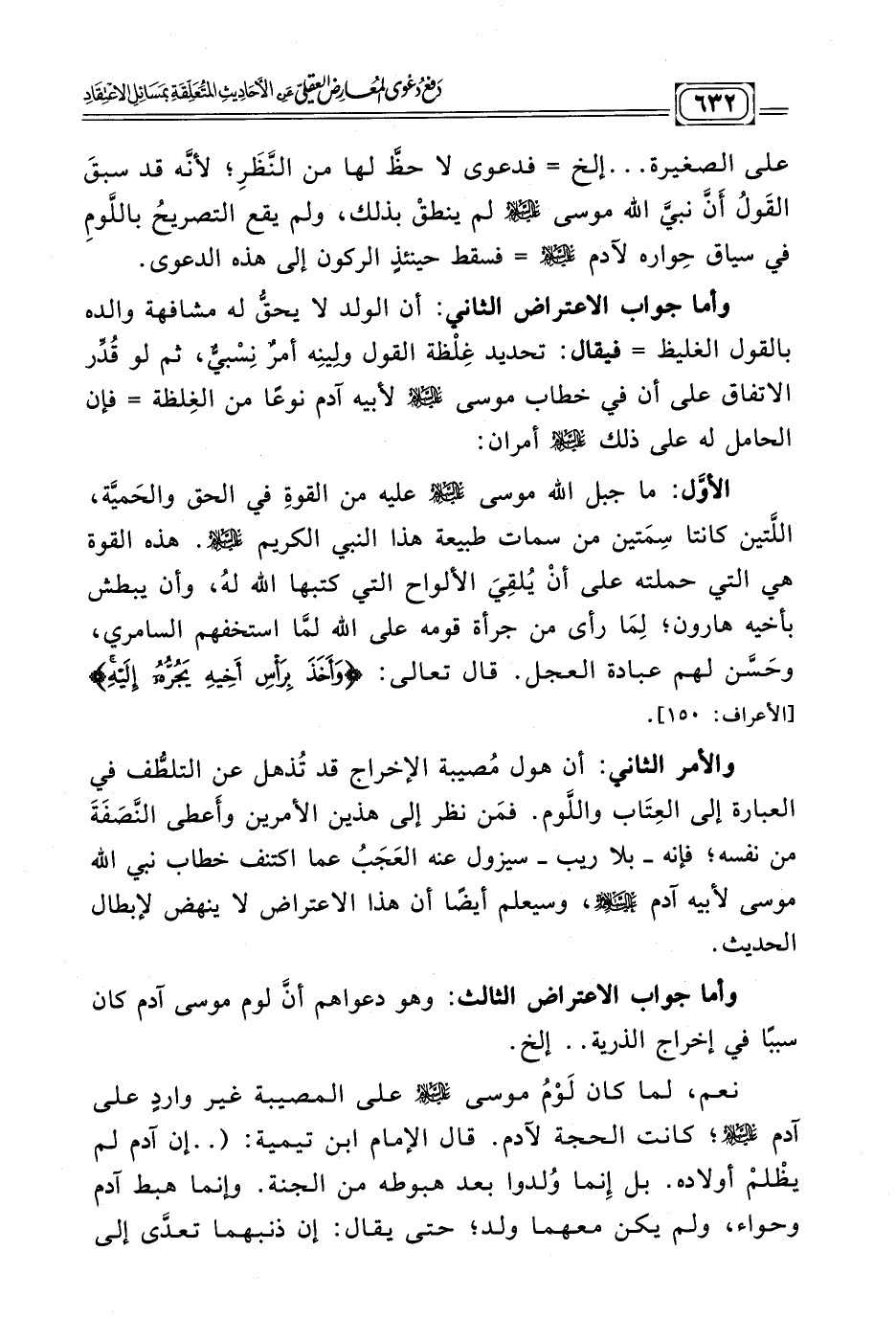 والأمر الثاني: أن هول مُصيبة الإخراج قد تُذهل عن التلطُّف في العبارة إلى العِتَاب واللّوم. فمَن نظر إلى هذين الأمرين وأَعطى النَّصَفَةَ من نفسه؛ فإنه -بلا ريب- سيزول عنه العَجَبُ عما اكتنف خطاب نبي الله موسى لأبيه آدم - رضي الله عنه -، وسيعلم أيضًا أن هذا الاعتراض لا ينهض لإبطال الحديث.