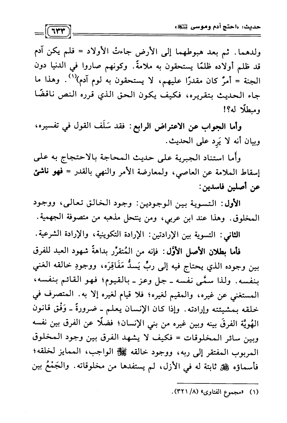 وأَما استناد الجبرية على حديث المحاجة بالاحتجاج به على إسقاط الملامة عن العاصي، ولمعارضة الأمر والنهي بالقدر = فهو ناشئ عن أصلين فاسدين: