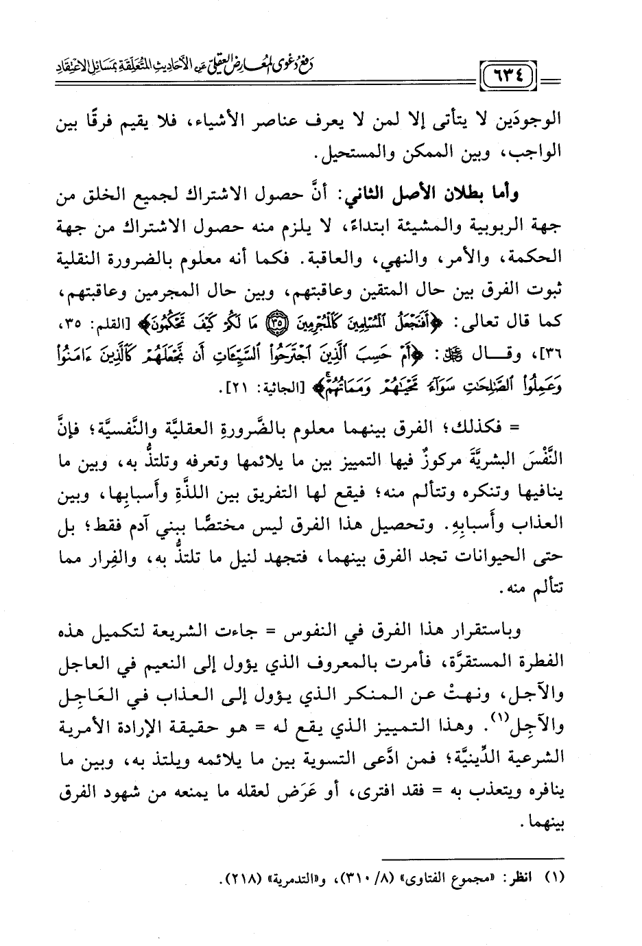 وأما بطلان الأصل الثاني: أنّ حصول الاشتراك لجميع الخلق من جهة الربوبية والمشيئة ابتداءًا، لا يلزم منه حصول الاشتراك من جهة الحكمة، والأمر، والنهي، والعاقبة. فكما أنه معلوم بالضرورة النقلية التي تُثْبِتُ فرقًا بين حال المتقين وعاقبتهم، وبين حال المجرمين وعاقبتهم، كما قال تعالى: {أَفَنَجْعَلُ الْمُسْلِمِينَ كَالْمُجْرِمِينَ (٣٥) مَا لَكُمْ كَيْفَ تَحْكُمُونَ (٣٦)} القلم، وقال عز وجل: {أَمْ حَسِبَ الَّذِينَ اجْتَرَحُوا السَّيِّئَاتِ أَنْ نَجْعَلَهُمْ كَالَّذِينَ آمَنُوا وَعَمِلُوا الصَّالِحَاتِ سَوَاءً مَحْيَاهُمْ وَمَمَاتُهُمْ} الجاثية: ٢١