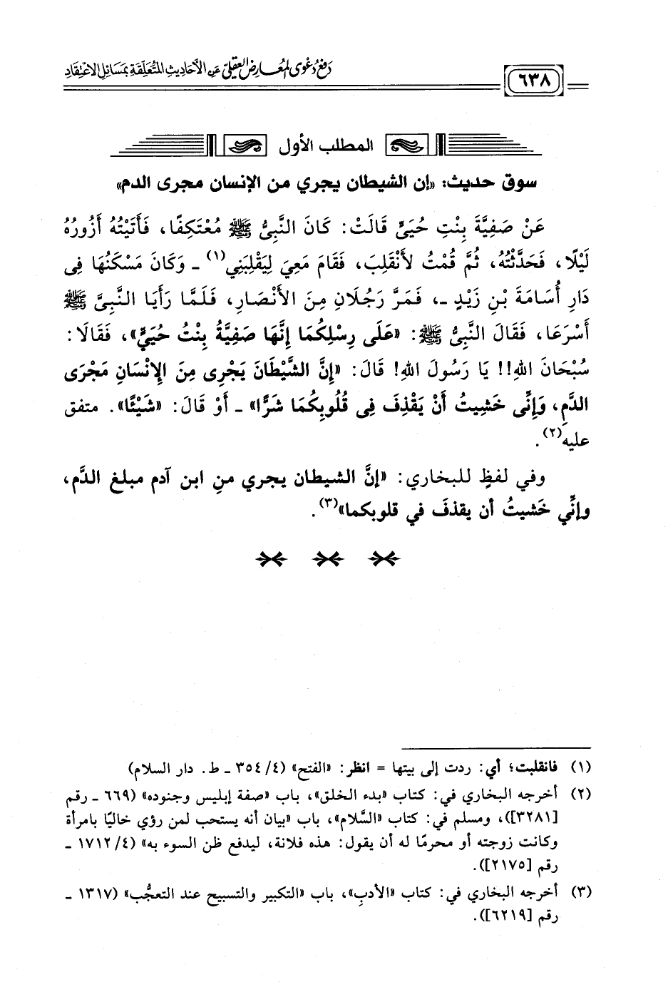 عَنْ صَفِيَّةَ بِنْتِ حُيَىٍّ قَالَتْ: كَانَ النَّبِىُّ - صلى الله عليه وسلم - مُعْتَكِفًا فَأَتَيْتُهُ أَزُورُهُ لَيْلًا فَحَدَّثْتُهُ ثُمَّ قُمْتُ لأَنْقَلِبَ فَقَامَ مَعِىَ لِيَقْلِبَنِى (¬١) -وَكَانَ مَسْكَنُهَا فِى دَارِ أُسَامَةَ بْنِ زَيْدٍ-، فَمَرَّ رَجُلَانِ مِنَ الأَنْصَارِ، فَلَمَّا رَأَيَا النَّبِىَّ - صلى الله عليه وسلم - أَسْرَعَا، فَقَالَ النَّبِىُّ - صلى الله عليه وسلم -: (عَلَى رِسْلِكُمَا إِنَّهَا صَفِيَّةُ بِنْتُ حُيَىٍّ) فَقَالَا: سُبْحَانَ اللَّهِ!! يَا رَسُولَ اللَّهِ! قَالَ: (إِنَّ الشَّيْطَانَ يَجْرِى مِنَ الإِنْسَانِ مَجْرَى الدَّمِ، وَإِنِّى خَشِيتُ أَنْ يَقْذِفَ فِى قُلُوبِكُمَا شَرًّا) - أَوْ قَالَ: (شَيْئًا). متفق عليه (¬٢).