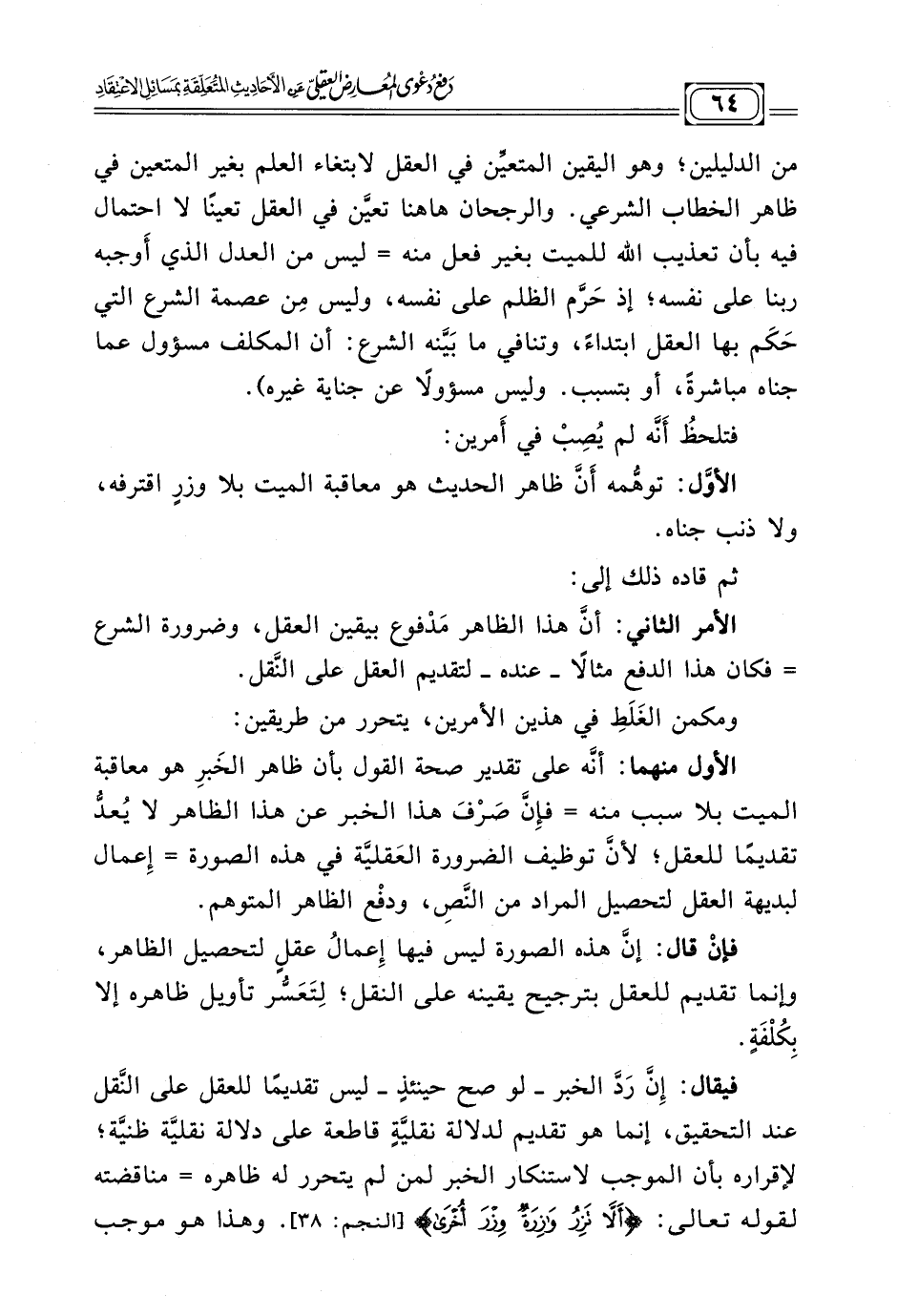 كتاب دفع دعوى المعارض العقلي عن الأحاديث المتعلقة بمسائل الاعتقاد