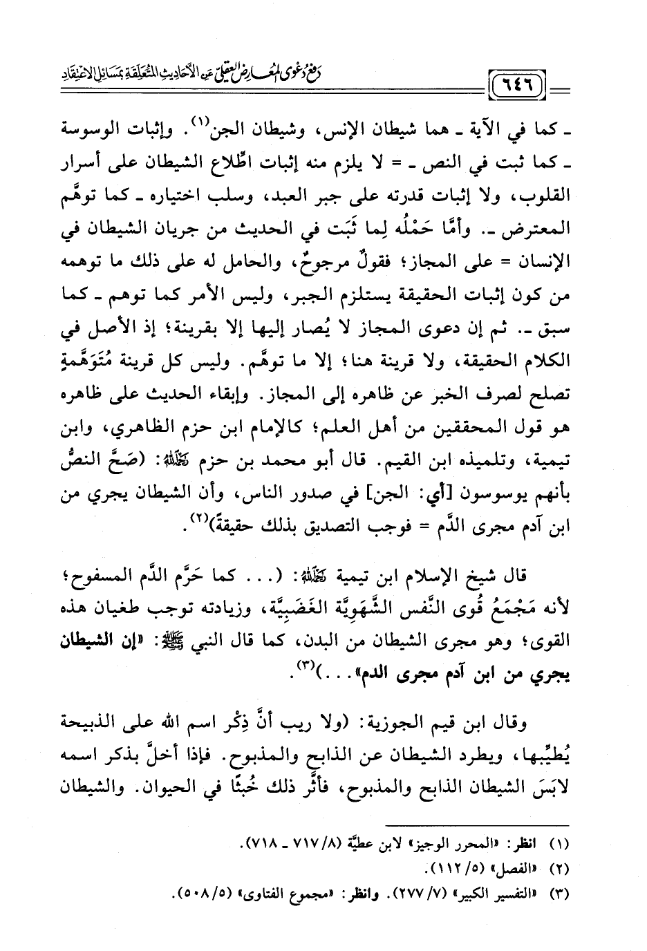 -كما في الآية- هما شيطان الإنس، وشيطان الجن (¬١) . وإثبات الوسوسة -كما ثبت في النص- = لا يلزم منه إثبات اطّلاع الشيطان على أسرار القلوب، ولا إثبات قدرته على جبر العبد، وسلب اختياره - كما توهّم المعترض-. وأمّا حَمْلُه لِما ثَبَت في الحديث من جريان الشيطان في الإنسان = على المجاز؛ فقولٌ مرجوحٌ، والحامل له على ذلك ما توهمه من كون إثبات الحقيقة يستلزم الجبر، وليس الأمر كما توهم -كما سبق-. ثم إن دعوى المجاز لا يُصار إليها إلا بقرينة؛ إذ الأصل في الكلام الحقيقة، ولا قرينة هنا؛ إلا ما توهَّم. وليس كل قرينة مُتَوَهَّمةٍ تصلح لصرف الخبر عن ظاهره إلى المجاز. وإبقاء الحديث على ظاهره هو قول المحققين من أهل العلم؛ كالإمام ابن حزم الظاهري، وابن تيمية، وتلميذه ابن القيم. قال أبو محمد ابن حزم - رحمه الله -: (صَحّ النصُّ بأنهم يوسوسون [أي الجن] في صدور الناس، وأن الشيطان يجري من ابن آدم مجرى الدّم = فوجب التصديق بذلك حقيقةً) (¬٢) .