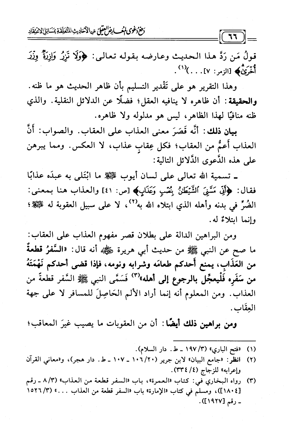 ومن البراهين الدالة على بطلان قصر مفهوم العذاب على العقاب: ما صح عن النبي - صلى الله عليه وسلم - من حديث أبي هريرة - رضي الله عنه - أنه قال: (السَّفرُ قطعةٌ من العَذَابِ يمنع أَحدكم طعامَه وشرابه ونومه، فإذا قضى أحدكم نَهْمَتَهُ من سَفَرِه فَلْيعجِّل بالرجوع إلى أهله) (¬٣) فَسَمَّى النبي - صلى الله عليه وسلم - السَّفر قطعةً من العذاب. ومن المعلوم أنه إنما أراد الألم الحَاصِلَ للمسافر على جهة العِقَاب.