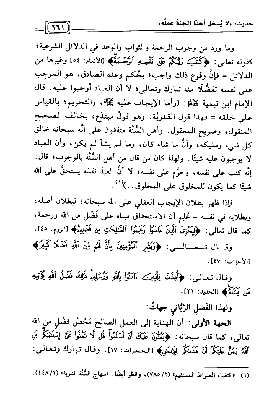 فإذا ظهر بطلان الإيجاب العقلي على الله سبحانه؛ لبطلان أصله، وبطلانه في نفسه = عُلِم أن الاستحقاق مبناه على فَضْل من الله ورحمة، كما قال تعالى: {لِيَجْزِيَ الَّذِينَ آمَنُوا وَعَمِلُوا الصَّالِحَاتِ مِنْ فَضْلِهِ} الروم: ٤٥