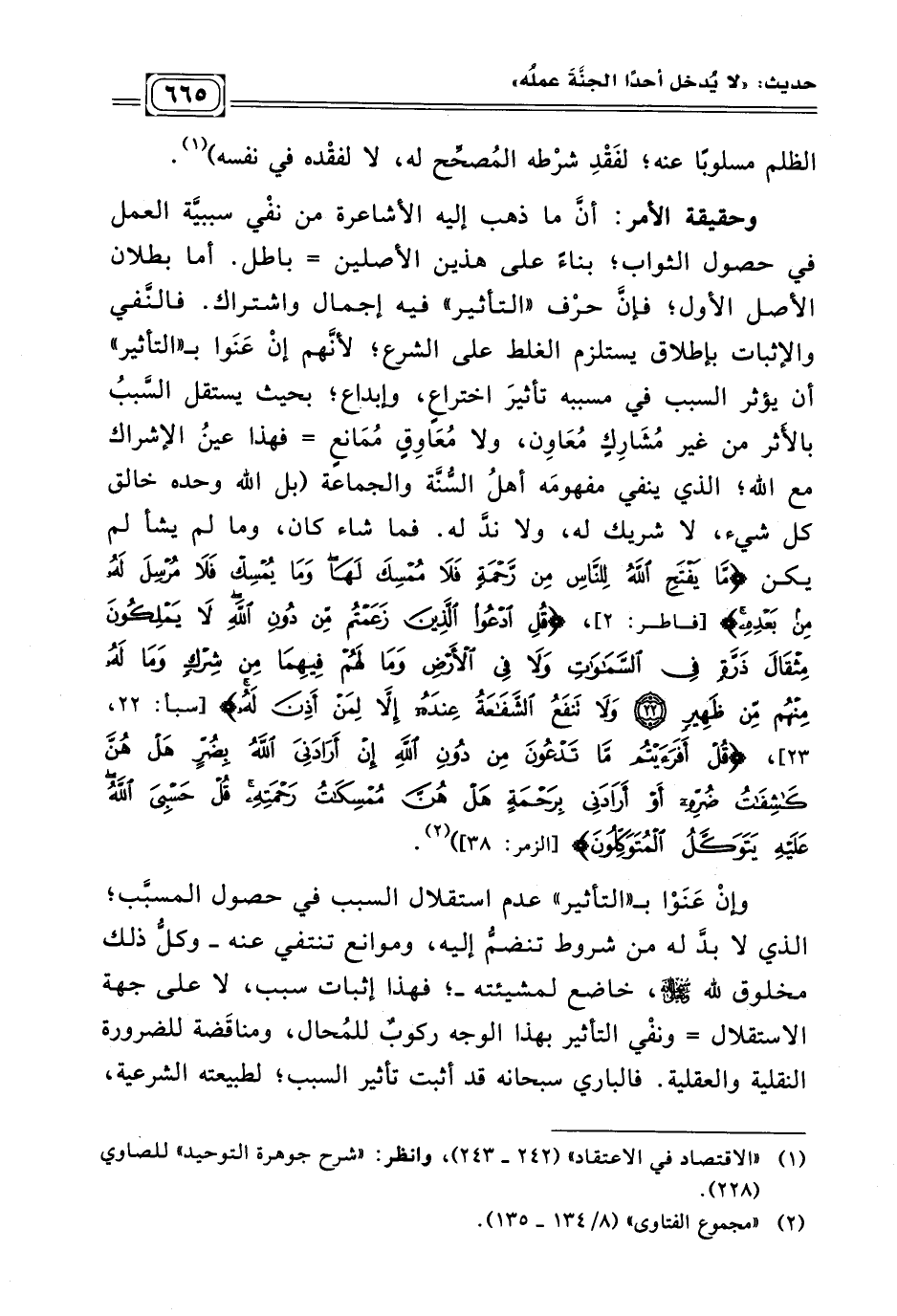 وحقيقة الأمر: أنّ ما ذهب إليه الأشاعرة من نفْي سببيَّة العمل في حصول الثواب؛ بناءً على هذين الأصلين = باطل. فأمّا بطلان الأصل الأول؛ فإنّ حرْف "التأثير" فيه إجمال واشتراك. فالنَّفي والإثبات بإطلاق يستلزم الغلط على الشرع فإنّهم إنْ عَنَوا بـ" التأثير" تأثير السبب في مسببه تأثيرَ اختراعٍ، وإبداع؛ بحيث يستقل السَّببُ بالأَثر من غير مُشَارِكٍ مُعَاوِن، ولا مُعَاوِقٍ مُمَانعٍ = فهذا عينُ الإشراك مع الله؛ الذي ينفي مفهومَه أهلُ السنة والجماعة «بل الله وحده خالق كل شيء، لا شريك له، ولا ندّ له. فما شاء كان، وما لم يشأ لم يكن {مَا يَفْتَحِ اللَّهُ لِلنَّاسِ مِنْ رَحْمَةٍ فَلَا مُمْسِكَ لَهَا وَمَا يُمْسِكْ فَلَا مُرْسِلَ لَهُ مِنْ بَعْدِهِ} فاطر: ٢ ({قُلِ ادْعُوا الَّذِينَ زَعَمْتُمْ مِنْ دُونِ اللَّهِ لَا يَمْلِكُونَ مِثْقَالَ ذَرَّةٍ فِي السَّمَاوَاتِ وَلَا فِي الْأَرْضِ وَمَا لَهُمْ فِيهِمَا مِنْ شِرْكٍ وَمَا لَهُ مِنْهُمْ مِنْ ظَهِيرٍ (٢٢) وَلَا تَنْفَعُ الشَّفَاعَةُ عِنْدَهُ إِلَّا لِمَنْ أَذِنَ لَهُ} سبأ: ٢٢ - ٢٣ {قُلْ أَفَرَأَيْتُمْ مَا تَدْعُونَ مِنْ دُونِ اللَّهِ إِنْ أَرَادَنِيَ اللَّهُ بِضُرٍّ هَلْ هُنَّ كَاشِفَاتُ ضُرِّهِ أَوْ أَرَادَنِي بِرَحْمَةٍ هَلْ هُنَّ مُمْسِكَاتُ رَحْمَتِهِ قُلْ حَسْبِيَ اللَّهُ عَلَيْهِ يَتَوَكَّلُ الْمُتَوَكِّلُونَ (٣٨)} الزمر: ٣٨» (¬٢) .