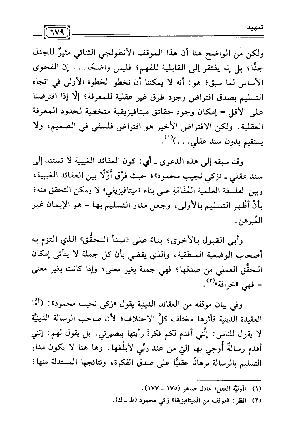 وقد سبقه إلى هذه الدعوى - أي: كون العقائد الغيبية لا تستند إلى سند عقلي - "زكي نجيب محمود"؛ حيث فرَّق أَوَّلًا بين العقائد الغيبية، وبين الفلسفة العلمية المُقَامَةِ على بناء " ميتافيزيقي" لا يمكن التحقق منه؛ بأنْ أظْهَر التسليم بالأولى، وجعل مدار التسليم بها = هو الإيمان غير المُبرهن.