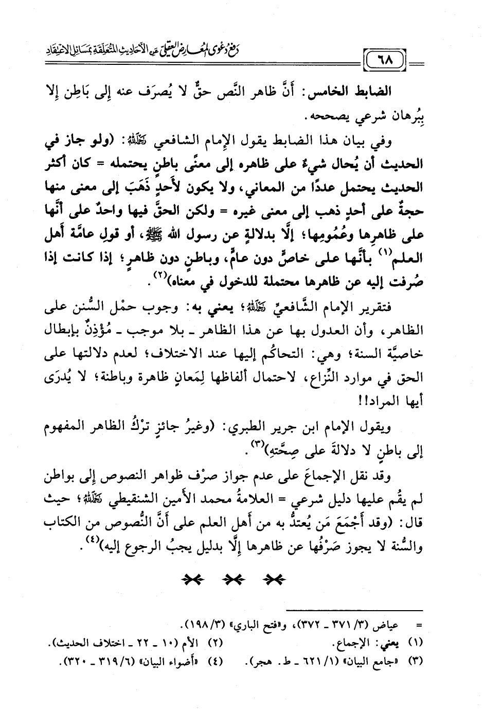 وقد نقل الإجماعَ على عدم جواز صرْف ظواهر النصوص إِلى بواطن لم يقُم عليها دليل شرعي = العلامةُ محمد الأَمين الشنقيطي - رحمه الله -؛ حيث قال: (وقد أَجْمَعَ مَن يُعتدّ به من أَهل العلم على أَنّ النّصوص من الكتاب والسُّنة لا يجوز صَرْفُها عن ظاهرها إِلَاّ بدليل يجبُ الرجوع إليه) (¬٤)