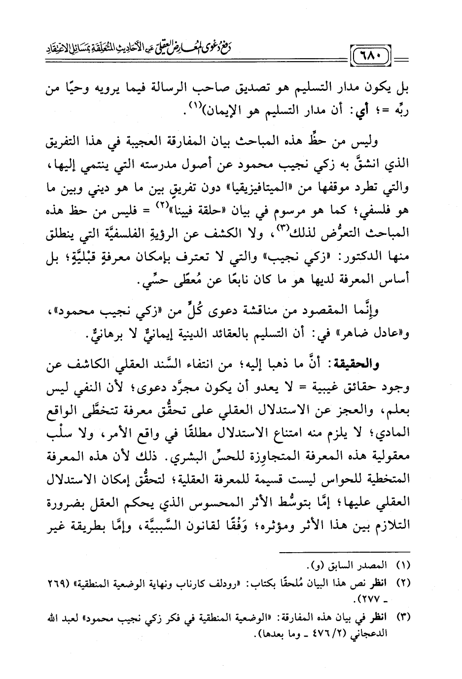 وإِنَّما المقصود من مناقشة دعوى كُلٍّ من "زكي نجيب محمود"، و "عادل ضاهر" في: أن التسليم بالعقائد الدينية إيمانيُّ لا برهانيُّ.