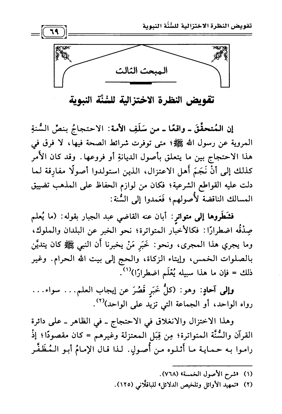 إن المُتحقِّق -واقعًا- من سَلَفِ الأمة: الاحتجاج بنصِّ السُّنةِ المروية عن رسول الله - صلى الله عليه وسلم -؛ متى توفرت شرائط الصحة فيها، بأن يرويها العدولُ الضابطون، بالسّند المتصل إلى رسول الله - صلى الله عليه وسلم -؛ لا فرق في هذا الاحتجاج بين ما يتعلق بأصول الديانةِ أو فروعها. وقد كان الأَمر كذلك إلى أنْ نَجَمَ أَهل الاعتزال، الذين استولدوا أصولًا مفارِقة لمادلت عليه القواطع الشرعية؛ فكان من لوازم الحفاظ على المذهب تضييق المسالك الناقضة لأُصولهم؛ فَعَمدوا إلى السُّنة: