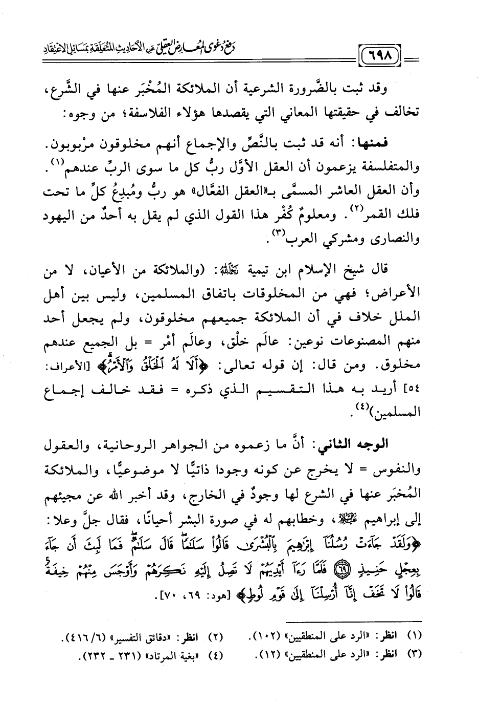 الوجه الثاني: أنّ ما زعموه من الجواهر الروحانية، والعقول والنفوس=لا يخرج عن كونه وجودا ذاتيًا لا موضوعيًا، والملائكة المُخبَر عنها في الشرع لها وجودٌ في الخارج، وقد أخبر الله عن مجيئهم إلى إبراهيم عليه السلام، وخطابهم له في صورة البشر أحيانًا، فقال جلّ وعلا: {وَلَقَدْ جَاءَتْ رُسُلُنَا إِبْرَاهِيمَ بِالْبُشْرَى قَالُوا سَلَامًا قَالَ سَلَامٌ فَمَا لَبِثَ أَنْ جَاءَ بِعِجْلٍ حَنِيذٍ (٦٩) فَلَمَّا رَأَى أَيْدِيَهُمْ لَا تَصِلُ إِلَيْهِ نَكِرَهُمْ وَأَوْجَسَ مِنْهُمْ خِيفَةً قَالُوا لَا تَخَفْ إِنَّا أُرْسِلْنَا إِلَى قَوْمِ لُوطٍ (٧٠)} هود.