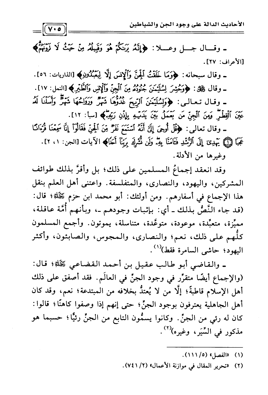 - والقاضي أبو طالب عقيل بن أحمد القضاعي - رحمه الله -؛ قال: (والإجماع أيضًا متقرّر في وجود الجنّ في العالَم. فقد أصفق على ذلك أهل الإسلام قاطبةً؛ إلاّ من لا يُعتدّ بخلافه من المبتدعة؛ نعم، وقد كان أهل الجاهلية يعترفون بوجود الجنّ؛ حتى إنهم إذا وصفوا كاهنا؛ قالوا: كان له رييٌّ من الجنّ. وكانوا يسمّون التابع من الجنّ رئيًّا؛ حسبما هو مذكور في السِّيَر، وغيره) (¬٢) .