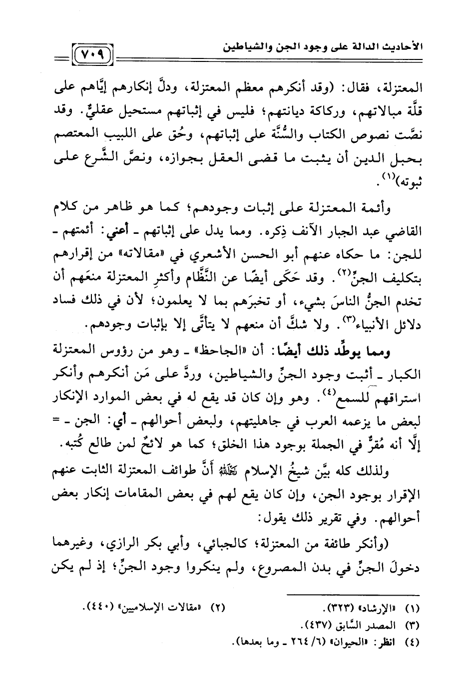 ومما يوطّد ذلك أيضًا: أن " الجاحظ" - وهو من رؤوس المعتزلة الكبار - أثبت وجود الجنّ والشياطين، وردّ على مَن أنكرهم وأنكر استراقهم للسمع (¬٤) . وهو وإن كان قد يقع له في بعض الموارد الإنكار لبعض ما يزعمه العرب في جاهليتهم، ولبعض أحوالهم - أي: الجن - = إلاّ أنه مُقرّ في الجملة بوجود هذا الخلق؛ كما هو لائحٌ لمن طالع كُتبه.