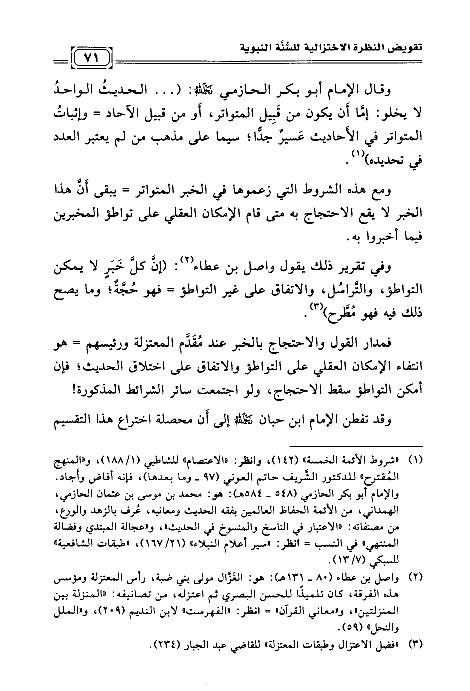 وقال الإمام أبو بكر الحازمي - رحمه الله -: ( ... الحديثُ الواحدُ لا يخلو: إمَّا أَن يكون من قَبِيل المتواتر، أَو من قبيل الآحاد = و إثباتُ المتواتر في الأَحاديث عَسيرٌ جدًّا؛ سيما على مذهب من لم يعتبر العدد في تحديده) (¬١)