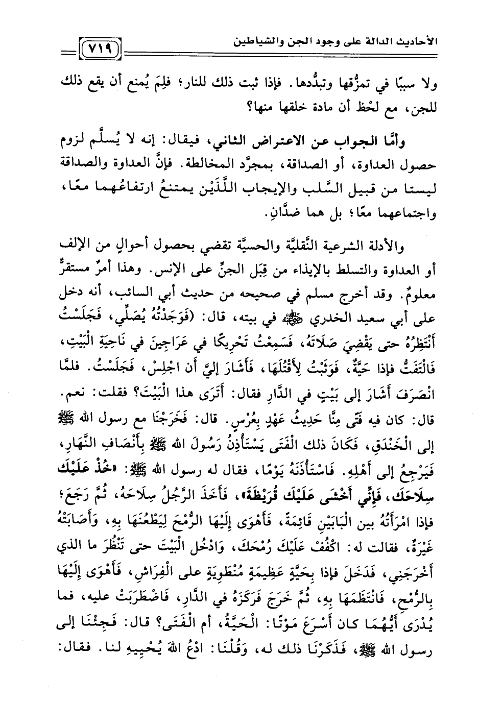 والأدلة الشرعية النَّقليَّة والحسيَّة تقضي بحصول أحوالٍ من الإلف أو العداوة والتسلط بالإيذاء من قِبَل الجنّ على الإنس. وهذا أمرٌ مستقرّ معلومٌ. وقد أخرج مسلم في صحيحه من حديث أبي السائب، أنه دخل على أبي سعيد الخدري - رضي الله عنه - في بيته، قال: (فَوَجَدْتُهُ يُصَلِّي، فَجَلَسْتُ أَنْتَظِرُهُ حتى يَقْضِيَ صَلَاتَهُ، فَسَمِعْتُ تَحْرِيكًا في عَرَاجِينَ في نَاحِيَةِ الْبَيْتِ، فَالْتَفَتُّ فإذا حَيَّةٌ، فَوَثَبْتُ لِأَقْتُلَهَا، فَأَشَارَ إليّ أَنْ اجْلِسْ، فَجَلَسْتُ. فلمَّا انْصَرَفَ أَشَارَ إلى بَيْتٍ في الدَّارِ فقال: أَتَرَى هذا الْبَيْتَ؟ فقلت: نعم. قال: كان فيه فَتًى مِنَّا حَدِيثُ عَهْدٍ بِعُرْسٍ. قال: فَخَرَجْنَا مع رسول اللَّهِ - صلى الله عليه وسلم - إلى الْخَنْدَقِ، فَكَانَ ذلك الْفَتَى يَسْتَأْذِنُ رَسُولَ اللَّهِ - صلى الله عليه وسلم - بِأَنْصَافِ النَّهَارِ، فَيَرْجِعُ إلى أَهْلِهِ. فَاسْتَأْذَنَهُ يَوْمًا، فقال له رسول اللَّهِ - صلى الله عليه وسلم -: (خُذْ عَلَيْكَ سِلَاحَكَ، فَإِنِّي أَخْشَى عَلَيْكَ قُرَيْظَةَ) فَأَخَذَ الرَّجُلُ سِلَاحَهُ، ثُمَّ رَجَعَ؛ فإذا امْرَأَتُهُ بين الْبَابَيْنِ قَائِمَةً، فَأَهْوَى إِلَيْهَا الرُّمْحَ لِيَطْعنَهَا بِهِ، وَأَصَابَتْهُ غَيْرَةٌ، فقالت له: اكْفُفْ عَلَيْكَ رُمْحَكَ، وَادْخُل الْبَيْتَ حتى تَنْظُرَ ما الذي أَخْرَجَنِي، فَدَخَلَ فإذا بِحَيَّةٍ عَظِيمَةٍ مُنْطَوِيَةٍ على الْفِرَاشِ، فَأَهْوَى إِلَيْهَا بِالرُّمْحِ، فَانْتَظَمَهَا بِهِ، ثُمَّ خَرَجَ فَرَكَزَهُ في الدَّارِ، فَاضْطَرَبَتْ عليه، فما يُدْرَى أَيُّهُمَا كان أَسْرَعَ مَوْتًا: الْحَيَّةُ، أَمْ الْفَتَى؟ قال: فَجِئْنَا إلى رسول اللَّهِ - صلى الله عليه وسلم -، فَذَكَرْنَا ذلك له، وَقُلْنَا: ادْعُ اللَّهَ يُحْيِيهِ لنا.