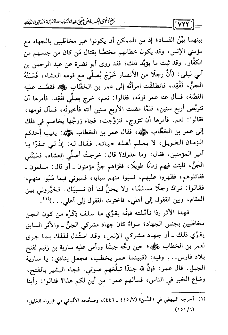 فهذا الأثر إذا تأمّلته فإنّه يقوّي ما سلف ذِكْرُه من كون الجن مخاطَبين بجنس الجهاد؛ سواءً كان جهاد مشركي الجنّ - والأثر السابق يقوّي ذلك - أو جهاد مشركي الإنس، وقد استُدل لذلك بما جرى لعمر بن الخطاب - رضي الله عنه -؛ حين وجّه جيشًا ورأس عليه سارية بن زنيم لفتح بلاد فارس ... وفيه: (فبينما عمر يخطب، فجعل ينادي: يا سارية الجبل. قال عمر: فإنّ لله جندًا تبلّغهم صوتي. فجاء البشير بالفتح، وشاع الخبر في الناس، فسألهم عمر: من أين لكم هذا؟ فقالوا: رأينا