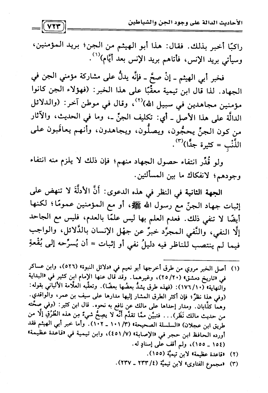 فخبر أبي الهيثم - إنْ صحّ - فإنّه يدلّ على مشاركة مؤمني الجن في الجهاد. لذا قال ابن تيمية معقّبًا على هذا الخبر: (فهؤلاء الجن كانوا مؤمنين مجاهدين في سبيل الله) (¬٢) وقال في موطن آخر: (والدلائل الدالّة على هذا الأصل - أي: تكليف الجنّ -، وما في الحديث، والآثار من كون الجنِّ يحجُّون، ويصلُّون، ويجاهدون، وأنهم يعاقَبون على الذَّنْبِ = كثيرة جدًّا) (¬٣) .