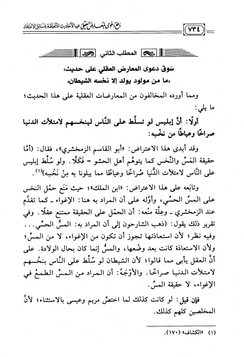 المطلب الثاني: سَوق دعوى المعارض العقلي على حديث (ما من مولود يولد إلا نخسه الشيطان):