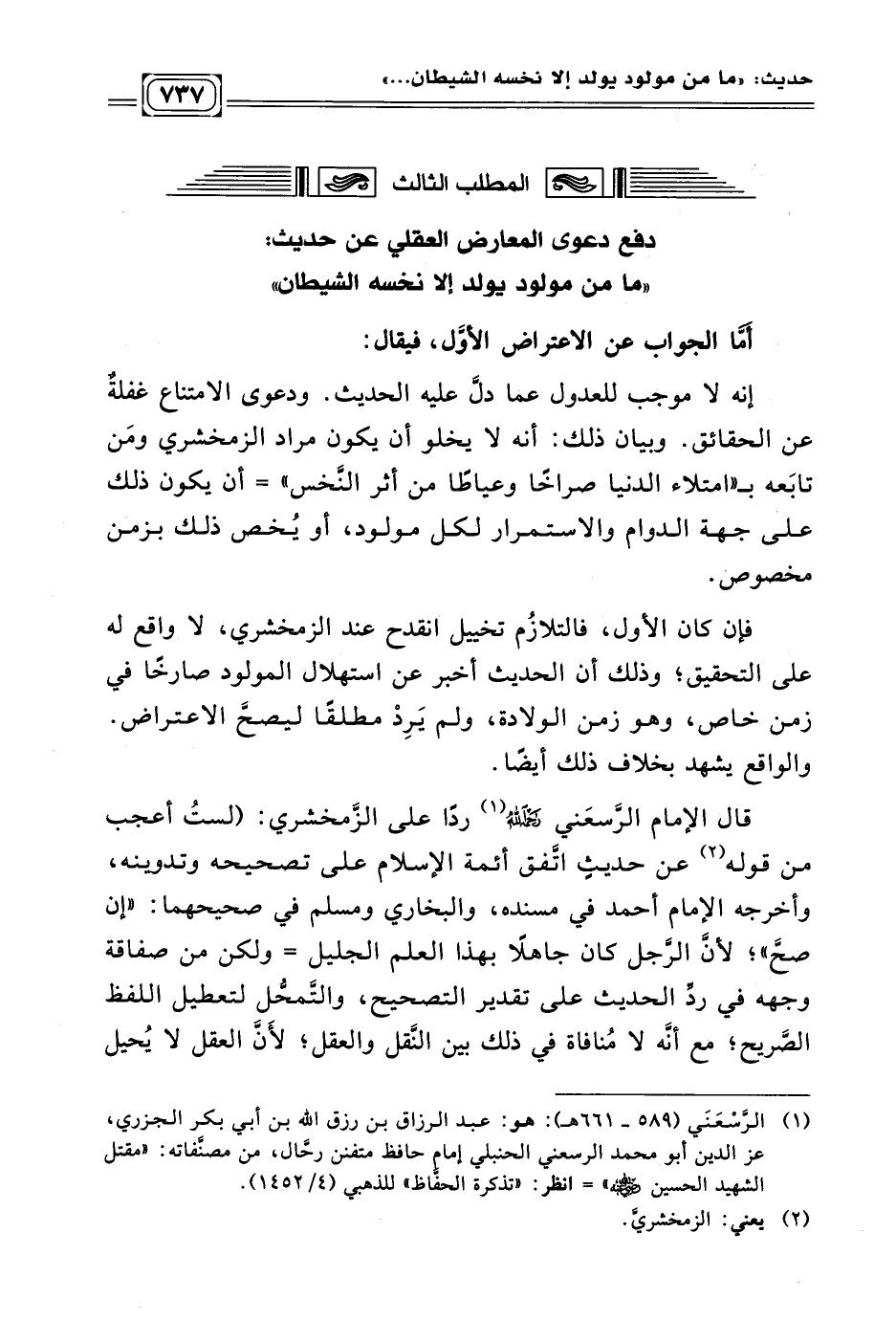 فإن كان الأول، فالتلازُم تخييل انقدح عند الزمخشري، لا واقع له على التحقيق؛ وذلك أن الحديث أخبر عن استهلال المولود صارخًا في زمن خاص، وهو زمن الولادة، ولم يَرِدْ مطلقًا ليصحّ الاعتراض. والواقع يشهد بخلاف ذلك أيضًا.