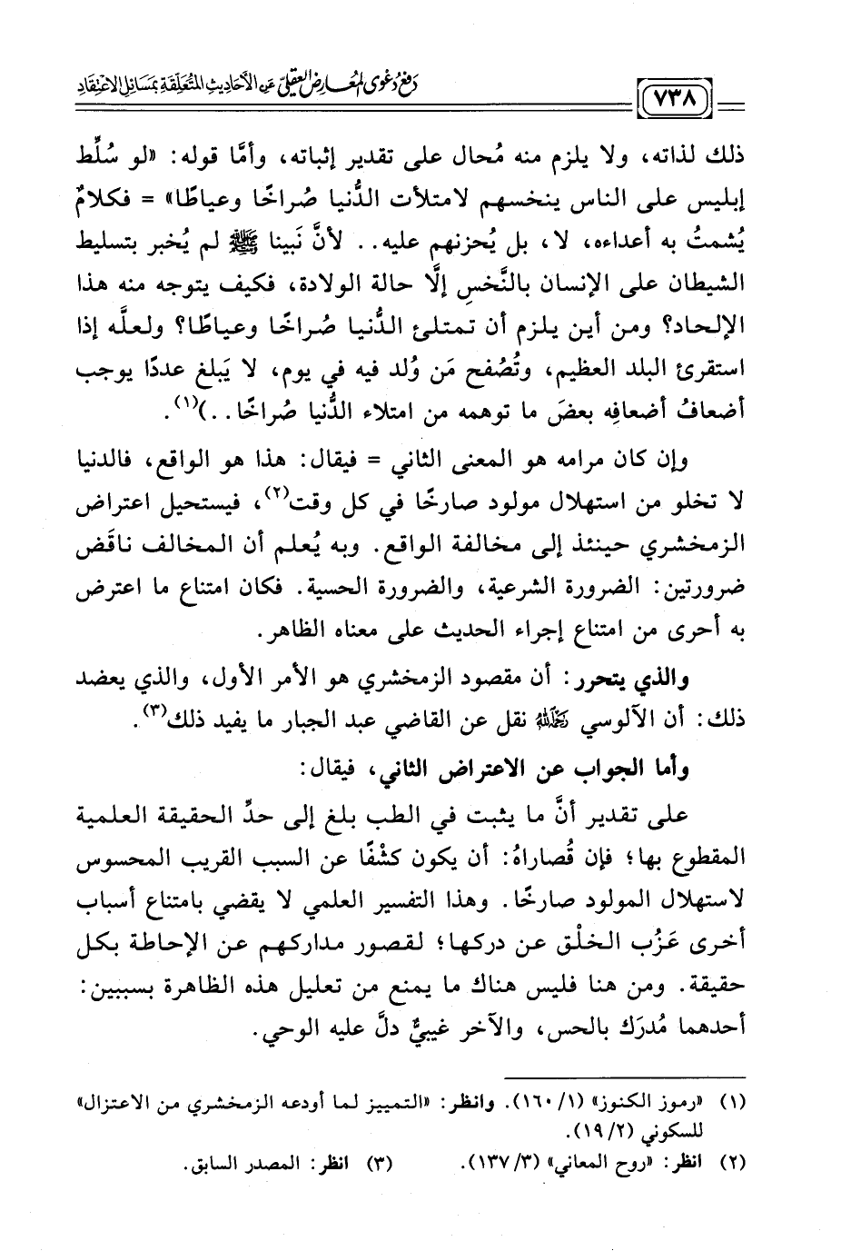 وإن كان مرامه هو المعنى الثاني = فيقال: هذا هو الواقع، فالدنيا لا تخلو من استهلال مولود صارخًا في كل وقت (¬٢)، فيستحيل اعتراض الزمخشري حينئذ إلى مخالفة الواقع. وبه يُعلم أن المخالف ناقَض ضرورتين: الضرورة الشرعية، والضرورة الحسية. فكان امتناع ما اعترض به أحرى من امتناع إجراء الحديث على معناه الظاهر.