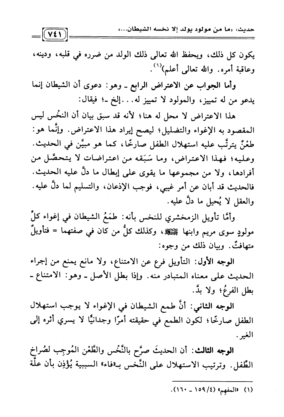 هذا الاعتراض لا محل له هنا؛ لأنه قد سبق بيان أن النخْس ليس المقصود به الإغواء والتضليل؛ ليصح إيراد هذا الاعتراض. وإنّما هو: طعْنٌ يترتّب عليه استهلال الطفل صارخًا، كما هو مبيّن في الحديث. وعليه؛ فهذا الاعتراض، وما سَبَقه من اعتراضات لا يتحصّل من أفرادها، ولا من مجموعها ما يقوى على إبطال ما دلّ عليه الحديث. فالحديث قد أبان عن أمر غيبي، فوجب الإذعان، والتسليم لما دلّ عليه. والعقل لا يُحيل ما دلّ عليه.