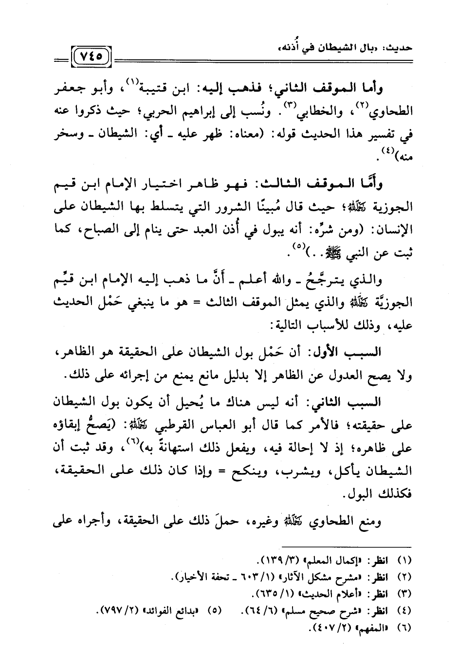 وأَمَّا الموقف الثالث؛ فهو ظاهر اختيار الإمام ابن قيم الجوزية - رحمه الله -؛ حيث قال مُبينًا الشرور التي يتسلط بها الشيطان على الإنسان: (ومن شرّه: أنه يبول في أُذن العبد حتى ينام إلى الصباح، كما ثبت عن النبي - صلى الله عليه وسلم - .. ) (¬٥) .