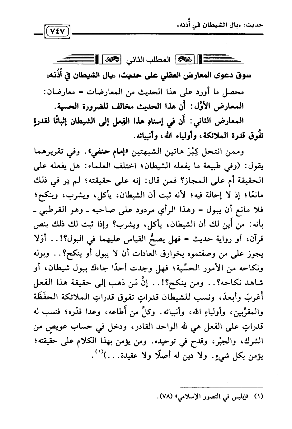 وممن انتحل كِبَر هاتين الشبهتين " إمام حنفي ". وفي تقريرهما يقول: «وفي طبيعة ما يفعله الشيطان؛ اختلف العلماء: هل يفعله على الحقيقة أم على المجاز؟ فمن قال: إنه على حقيقته؛ لم ير في ذلك مانعًا؛ إذ لا إحالة فيه؛ لأنه ثبت أن الشيطان، يأكل، ويشرب، وينكح؛ فلا مانع أن يبول = وهذا الرأي مردود على صاحبه - وهو القرطبي - بأنه: من أَين لك أن الشيطان، يأكل، ويشرب؟ وإذا ثبت لك ذلك بنص قرآن، أو رواية حديث = فهل يصحُّ القياس عليهما في البول؟! .. أوَلا يجوز على من وصفتموه بخوارق العادات أن لا يبول أو ينكح؟ .. وبوله ونكاحه من الأمور الحسّية؛ فهل وجدت أحدًا جاءك ببول شيطان، أو شاهد نكاحه؟ .. ومن ينكح؟! .. إنّ مَن ذهب إلى حقيقة هذا الفعل أَغربَ وأبعدَ، ونسب للشيطان قدراتٍ تفوق قدراتِ الملائكة الحفَظَة والمقرّبين، وأولياءِ الله، وأنبيائه. وكلّ من أَطاعه، وعدا قدْره؛ فنسب له قدراتٍ على الفعل هي لله الواحد القادر، ودخل في حساب عويصٍ من الشرك، والجبْر، وقدح في توحيده. ومن يؤمن بهذا الكلام على حقيقته؛ يؤمن بكل شيءٍ. ولا دين له أصلًا ولا عقيدة ... » (¬١).