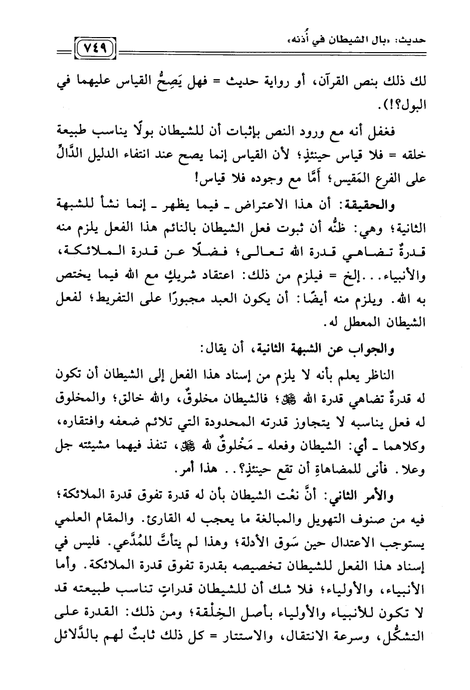 فغفل أنه مع ورود النص بإثبات أن للشيطان بولًا يناسب طبيعة خلقه = فلا قياس حينئذٍ؛ لأن القياس إنما يصح عند انتفاء الدليل الدّالّ على الفرع المَقيس؛ أَمَّا مع وجوده فلا قياس!
