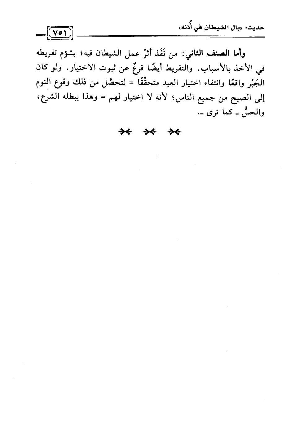 وأما الصنف الثاني: من نَفَذ أثرُ عمل الشيطان فيه؛ بشؤم تفريطه في الأخذ بالأسباب. والتفريط أيضًا فرعٌ عن ثبوت الاختيار. ولو كان الجَبْر واقعًا وانتفاء اختيار العبد متحقّقًا = لتحصَّل من ذلك وقوع النوم إلى الصبح من جميع الناس؛ لأنه لا اختيار لهم = وهذا يبطله الشرع، والحسّ -كما ترى-.