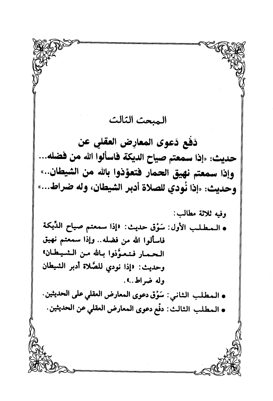 - المطلب الأول: سَوْق حديث (إذا سمعتم صياح الدِّيكة فاسألوا الله من فضله .. وإذا سمعتم نهيق الحمار فتعوَّذوا بالله من الشيطان) وحديث: (إذا نودي للصَّلاة أدبر الشيطان وله ضراط .. ).