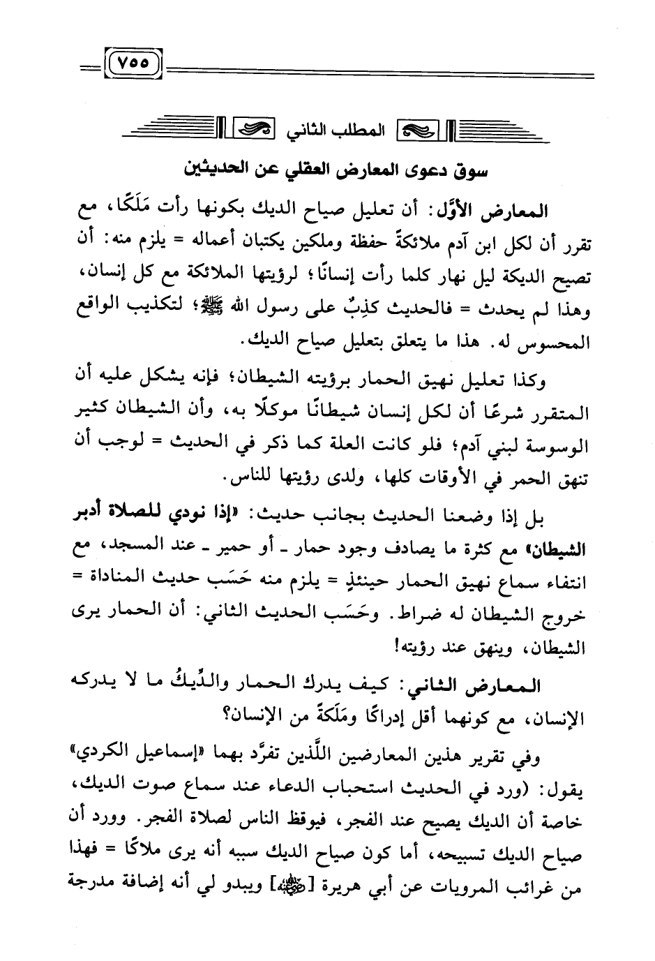 المعارض الأوَّل: أن تعليل صياح الديك بكونها رأت مَلَكًا، مع تقرر أن لكل ابن آدم ملائكةً حفظة وملكين يكتبان أعماله = يلزم منه: أن تصيح الديكة ليل نهار كلما رأت إنسانًا؛ لرؤيتها الملائكة مع كل إنسان، وهذا لم يحدث = فالحديث كذِبٌ على رسول الله - صلى الله عليه وسلم -؛ لتكذيب الواقع المحسوس له. هذا ما يتعلق بتعليل صياح الديك.