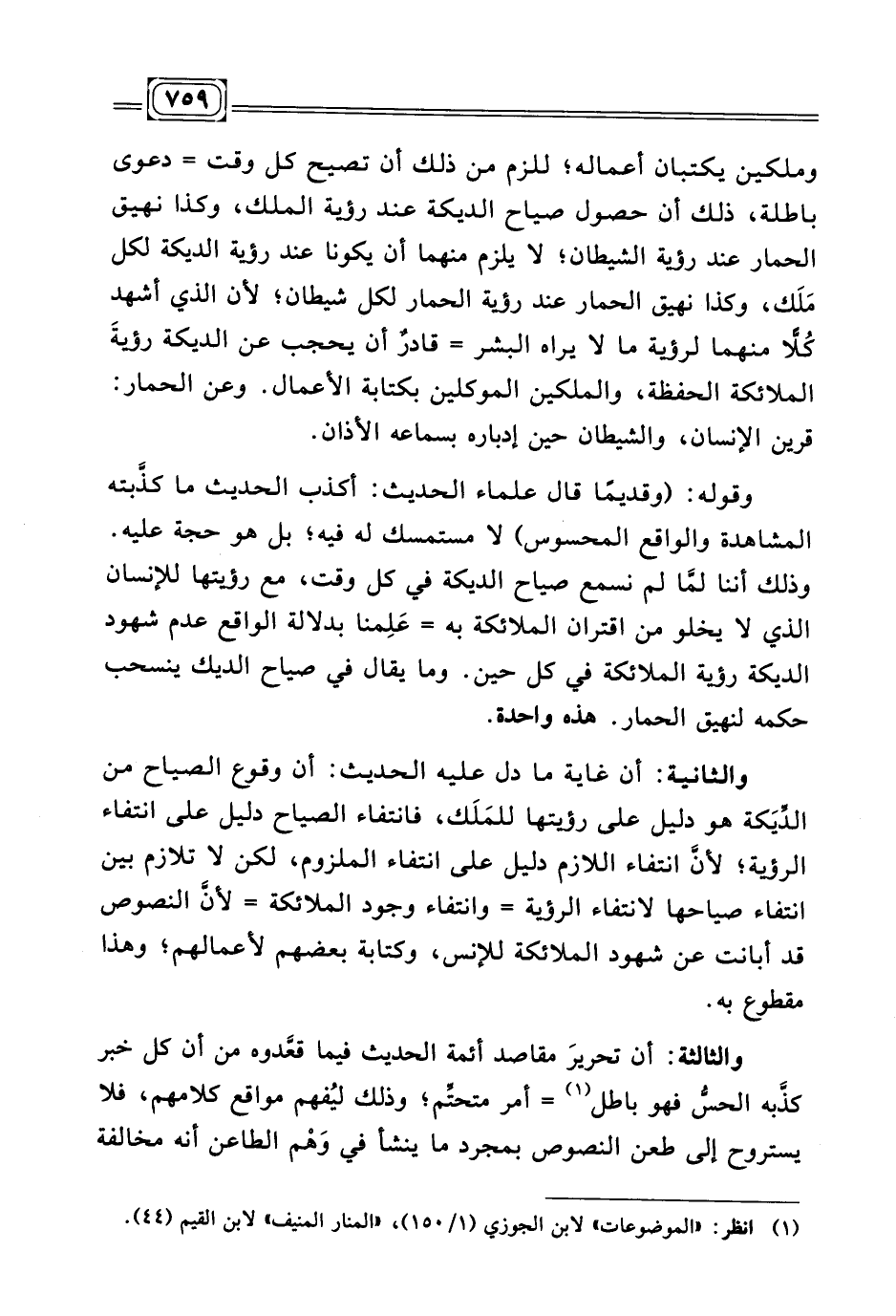 وملكين يكتبان أعماله؛ للزم من ذلك أن تصيح كل وقت = دعوى باطلة، ذلك أن حصول صياح الديكة عند رؤية الملك، وكذا نهيق الحمار عند رؤية الشيطان؛ لا يلزم منهما أن يكونا عند رؤية الديكة لكل مَلَك، وكذا نهيق الحمار عند رؤية الحمار لكل شيطان؛ لأن الذي أشهد كُلًا منهما لرؤية مالا يراه البشر = قادرٌ أن يحجب عن الديكة رؤيةَ الملائكة الحفظة، والملكين الموكلين بكتابة الأعمال. وعن الحمار: قرين الإنسان، والشيطان حين إدباره بسماعه الأذان.