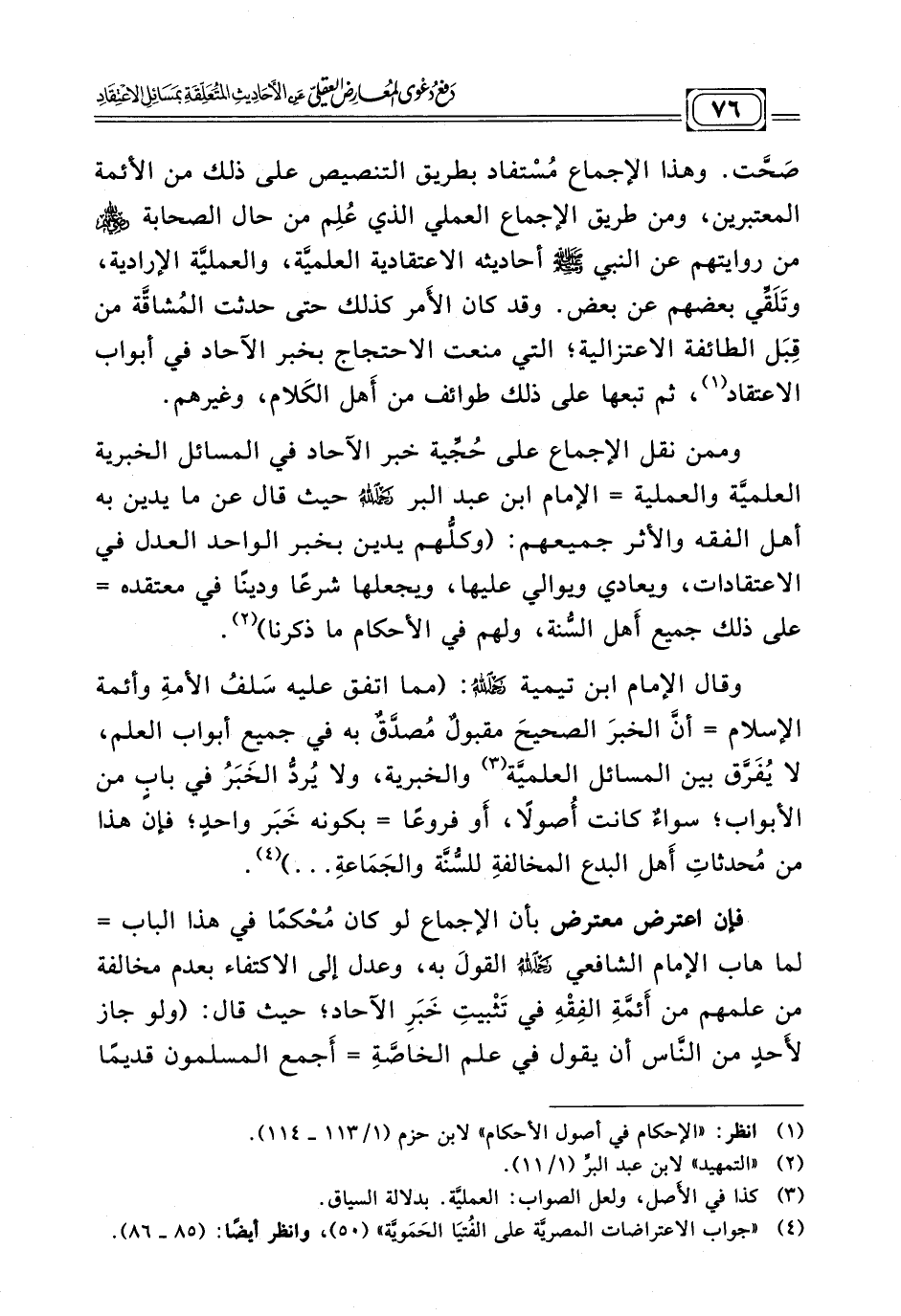 صَحّت. وهذا الإجماع مُسْتفاد بطريق التنصيص على ذلك من الأئمة المعتبرين، ومن طريق الإجماع العملي الذي عُلِم من حال الصحابة - رضي الله عنهم - من روايتهم عن النبي - صلى الله عليه وسلم - أحاديثه الاعتقادية العلميَّة، والعمليَّة الإرادية، وتَلَقِّي بعضهم عن بعض. وقد كان الأَمر كذلك حتى حدثت المُشاقّة من قِبَل الطائفة الاعتزالية؛ التي منعت الاحتجاج بخبر الآحاد في أبواب الاعتقاد (¬١)، ثم تبعها على ذلك طوائف من أَهل الكَلام، وغيرهم.