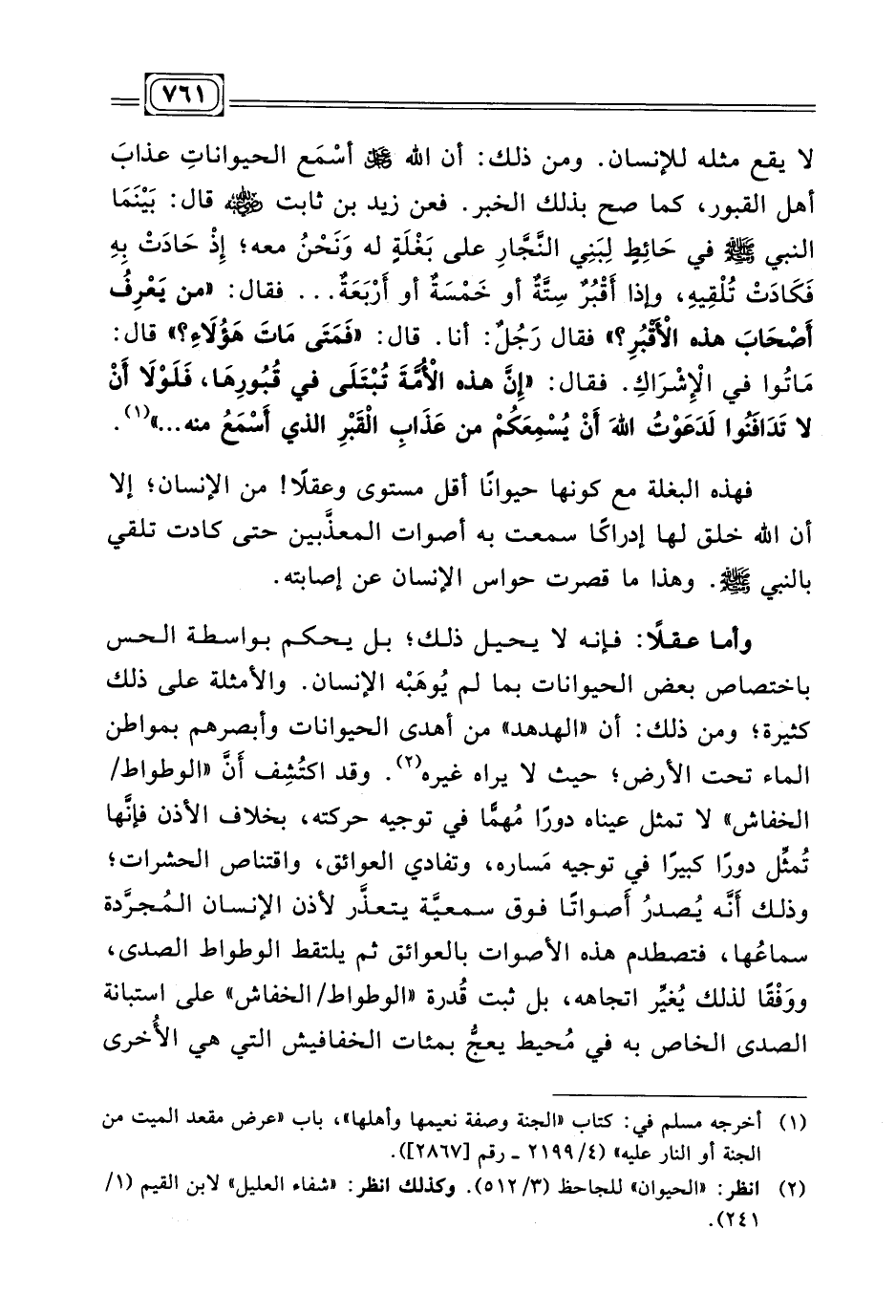 لا يقع مثله للإنسان. ومن ذلك: أن لله عز وجل أسْمَع الحيواناتِ عذابَ أهل القبور، كما صح بذلك الخبر. فعن زيد بن ثابت - رضي الله عنه - قال: بَيْنَمَا النبي - صلى الله عليه وسلم - في حَائِطٍ لِبَنِي النَّجَّارِ على بَغْلَةٍ له وَنَحْنُ معه؛ إِذْ حَادَتْ بِهِ فَكَادَتْ تُلْقِيهِ، وإذا أَقْبُرٌ سِتَّةٌ أو خَمْسَةٌ أو أَرْبَعَةٌ ... فقال: (من يَعْرِفُ أَصْحَابَ هذه الْأَقْبُرِ؟) فقال رَجُلٌ: أنا. قال (فَمَتَى مَاتَ هَؤُلَاءِ) قال: مَاتُوا في الْإِشْرَاكِ. فقال (إِنَّ هذه الْأُمَّةَ تُبْتَلَى في قُبُورِهَا، فَلَوْلَا أَنْ لَا تَدَافَنُوا لَدَعَوْتُ اللَّهَ أَنْ يُسْمِعَكُمْ من عَذَابِ الْقَبْرِ الذي أَسْمَعُ منه ... ) (¬١) .