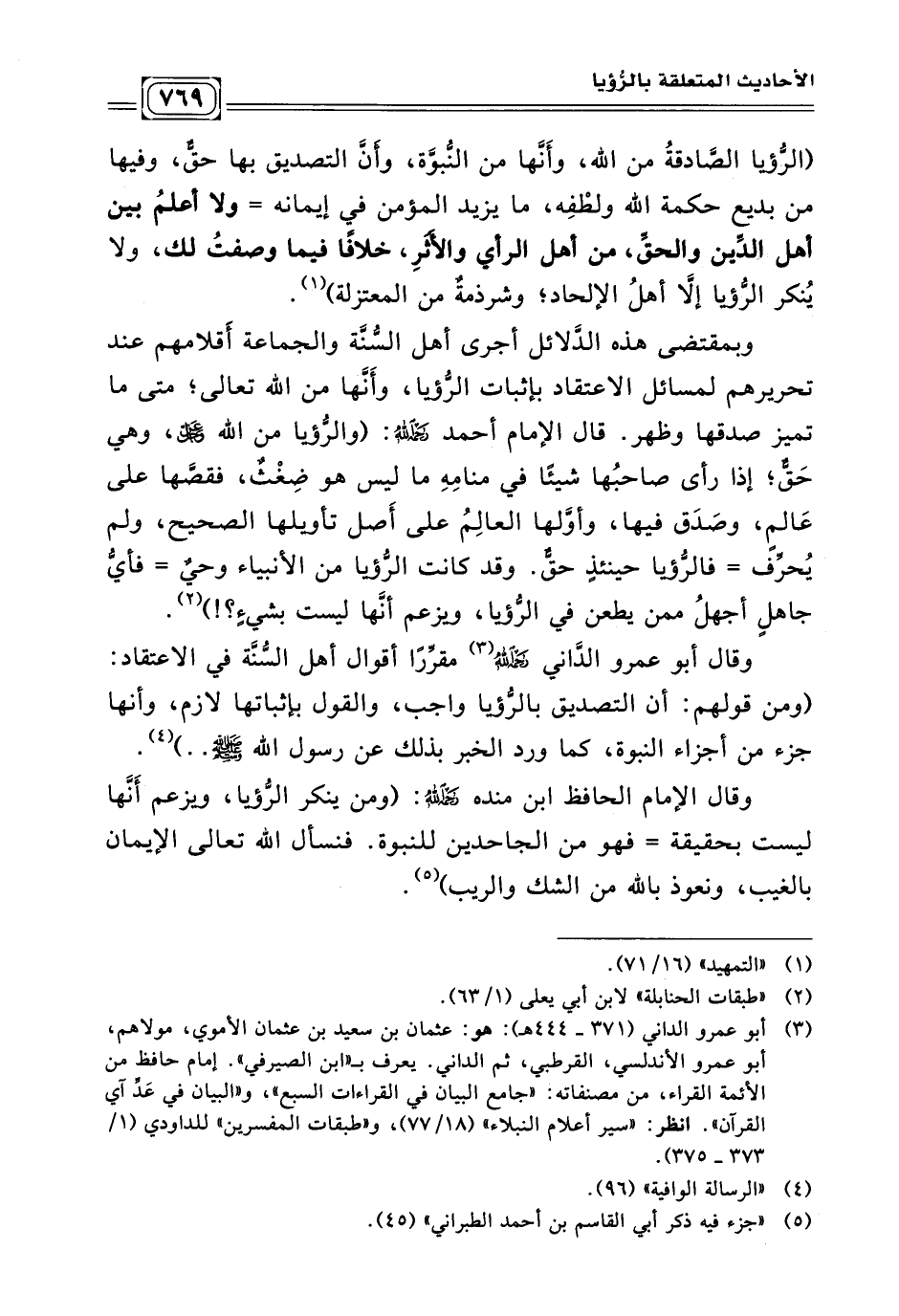 وقال أبو عمرو الدَّاني - رحمه الله - (¬٣) مقرِّرًا أقوال أهل السنة في الاعتقاد: (ومن قولهم: إن التصديق بالرُّؤيا واجب، والقول بإثباتها لازم، وأنها جزء من أجزاء النبوة، كما ورد الخبر بذلك عن رسول الله - صلى الله عليه وسلم - .. ) (¬٤) .