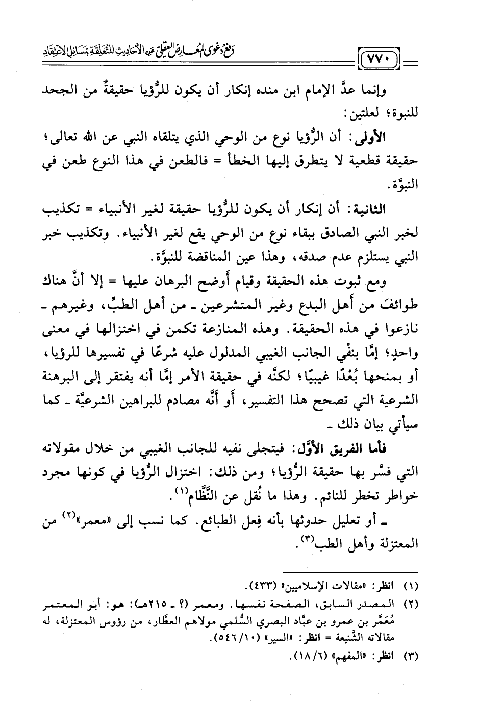 (¬٢) المصدر السابق، الصفحة نفسه. ومعمر (؟ -٢١٥ هـ):هو أبو المعتمر مُعَمَّر بن عمرو بن عبَّاد البصري السُّلمي مولاهم العطَّار، من رؤوس المعتزلة، له مقالاته الشَّنيعة =انظر "السير" (١٠/ ٥٤٦) .