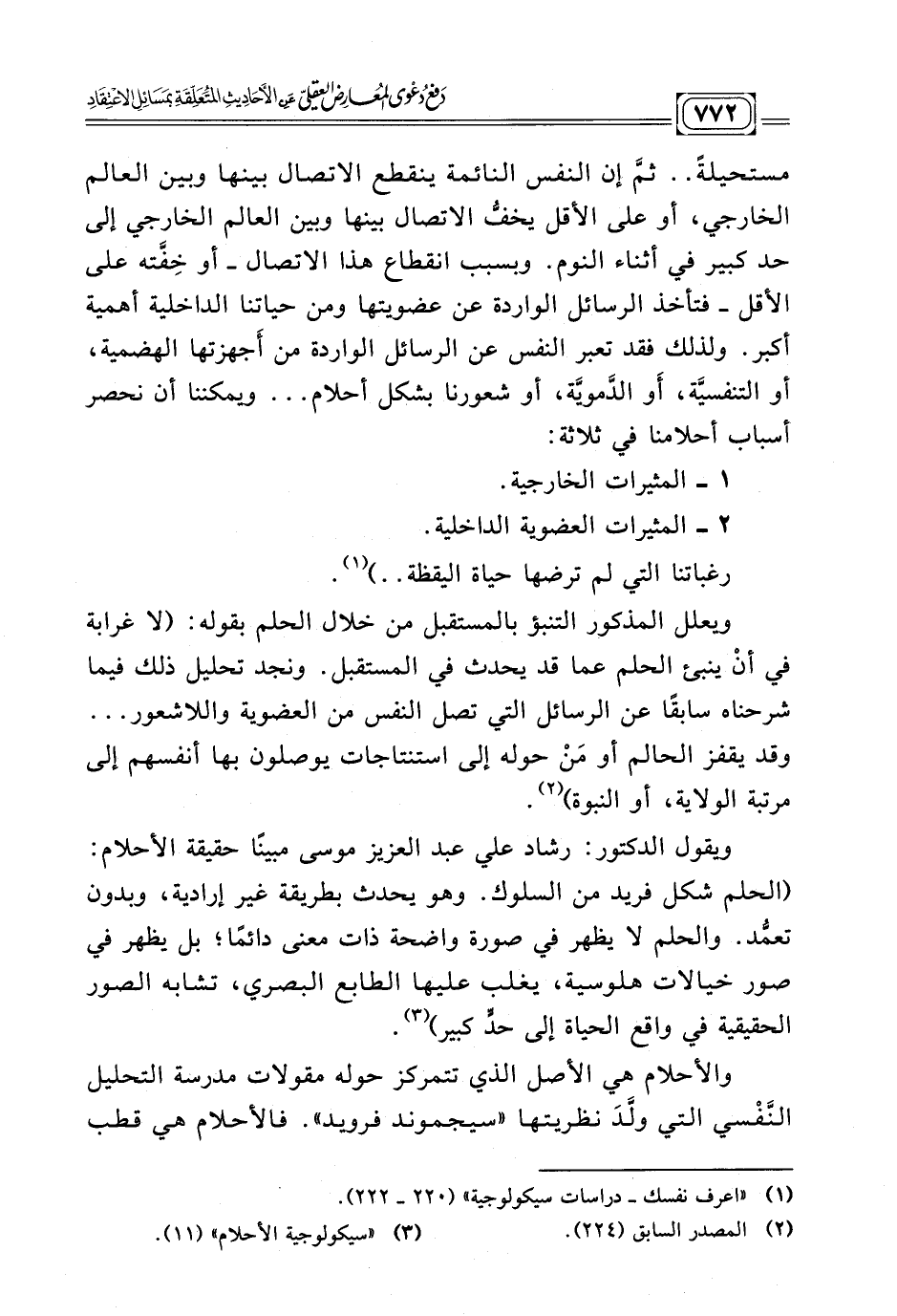 ويعلل المذكور التنبؤ بالمستقبل من خلال الحلم بقوله: (لا غرابة في أنْ ينبئ الحلم عما قد يحدث في المستقبل. ونجد تحليل ذلك فيما شرحناه سابقًا عن الرسائل التي تصل النفس من العضوية واللاشعور ... وقد يقفز الحالم أو مَنْ حوله إلى استنتاجات يوصلون بها أنفسهم إلى مرتبة الولاية، أو النبوة) (¬٢) .