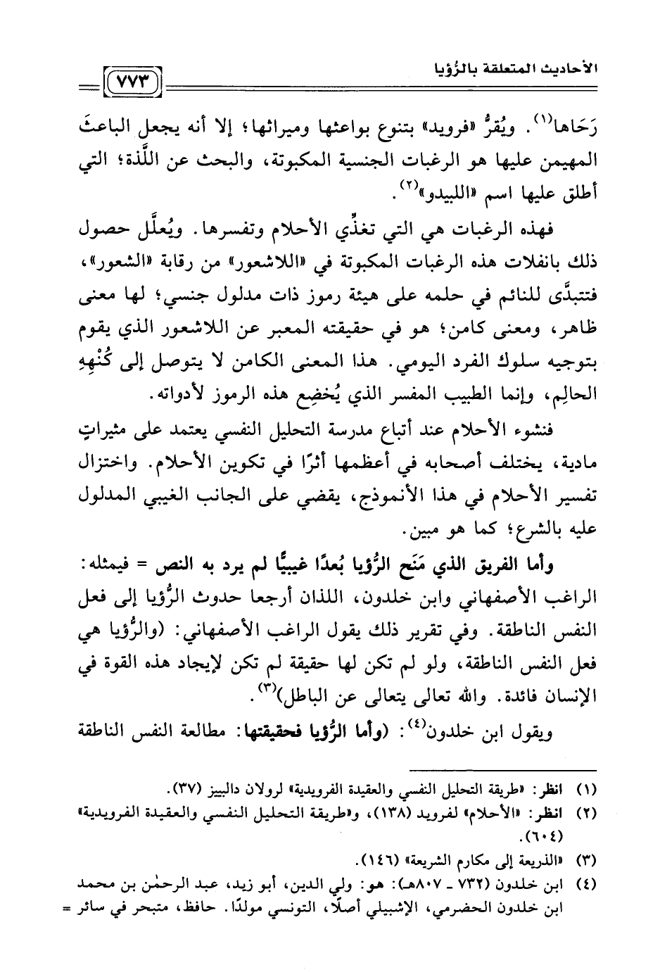 وأما الفريق الذي مَنَح الرُّؤيا بُعدًا غيبيًا لم يرد به النص = فيمثله: الراغب الأصفهاني وابن خلدون، اللذان أرجعا حدوث الرُّؤيا إلى فعل النفس الناطقة. وفي تقرير ذلك يقول الراغب الأصفهاني: (والرُّؤيا هي فعل النفس الناطقة، ولو لم تكن لها حقيقة لم تكن لإيجاد هذه القوة في الإنسان فائدة. والله يتعالى عن الباطل) (¬٣) .