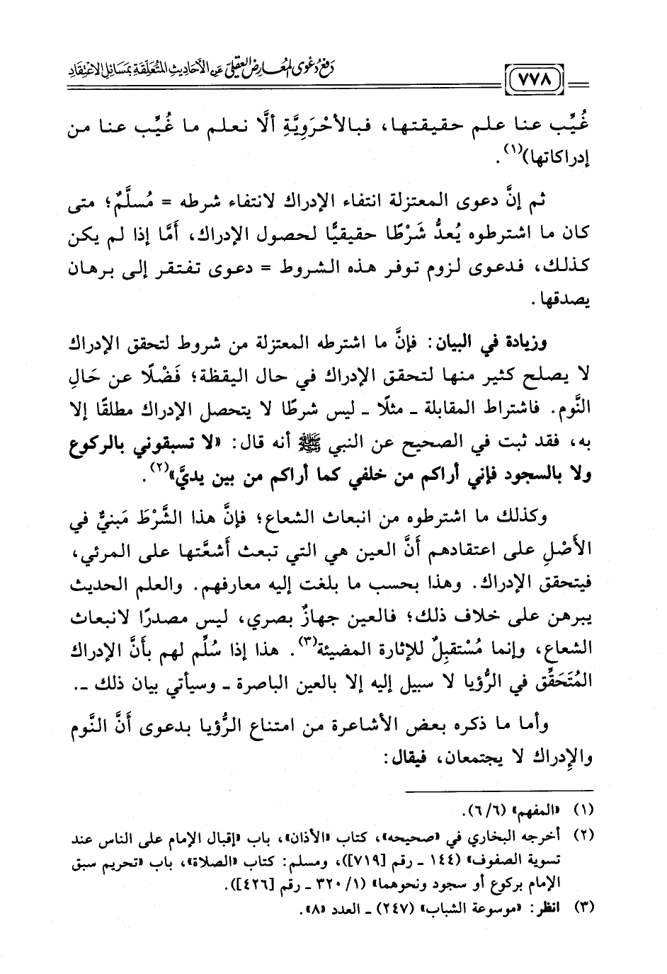 وزيادة في البيان: فإنَّ ما اشترطه المعتزلة من شروط لتحقق الإدراك لا يصلح كثير منها لتحقق الإدراك في حال اليقظة؛ فَضْلًا عن حَالِ النَّوم. فاشتراط المقابلة -مثلًا- ليس شرطًا لا يتحصل الإدراك مطلقًا إلا به، فقد ثبت في الصحيح عن النبي - صلى الله عليه وسلم - أنه قال: (لا تستبقوني بالركوع، ولا بالسجود فإني أراكم من خلفي كما أراكم من بين يديّ) (¬٢) .