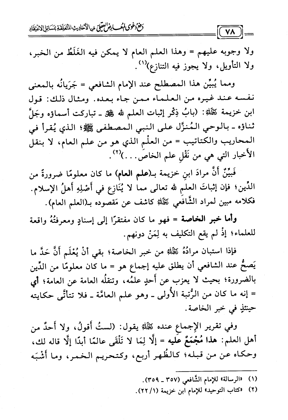 فَبيّنٌ أَنَّ مرادَ ابنِ خزيمة بـ (علم العام) ما كان معلومًا ضرورةً من الدِّين؛ فإن إثباتَ العلمِ لله تعالى مما لا يُنَازِع في أَصْلِهِ أَهلُ الإسلام. فكلامه مبين لمراد الشَّافعي - رحمه الله - كاشف عن مَقصوده بـ (العلم العام)