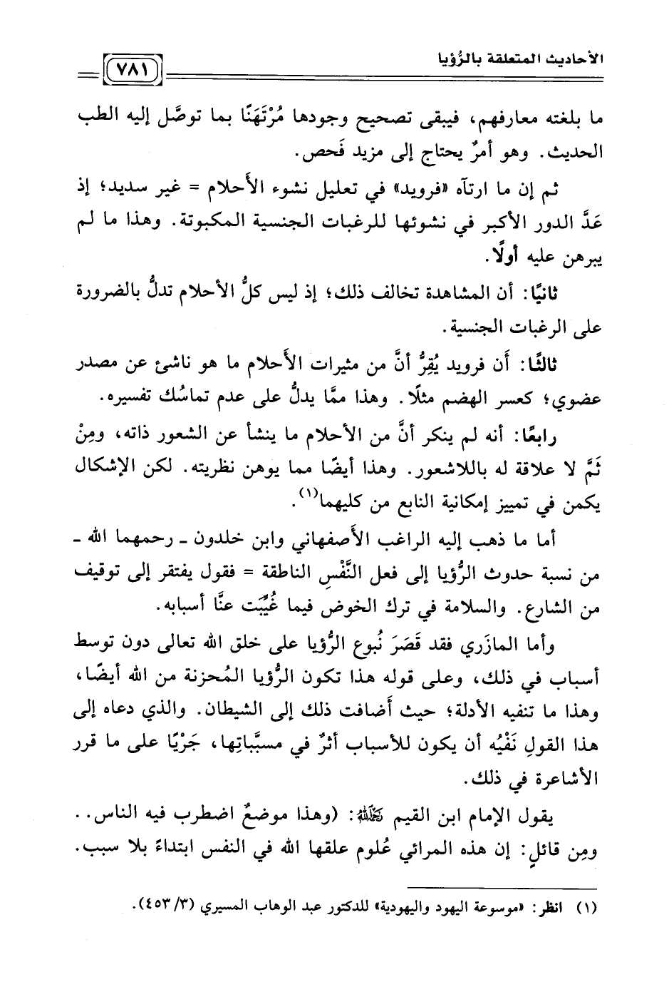 رابعًا: أنه لم ينكر أنّ من الأحلام ما ينشأ عن الشعور ذاته، ومِنْ ثَمّ لا علاقة له باللاشعور. وهذا أيضًا مما يوهن نظريته. لكن الإشكال يكمن في تمييز إمكانية النابع من كليهما (¬١) .