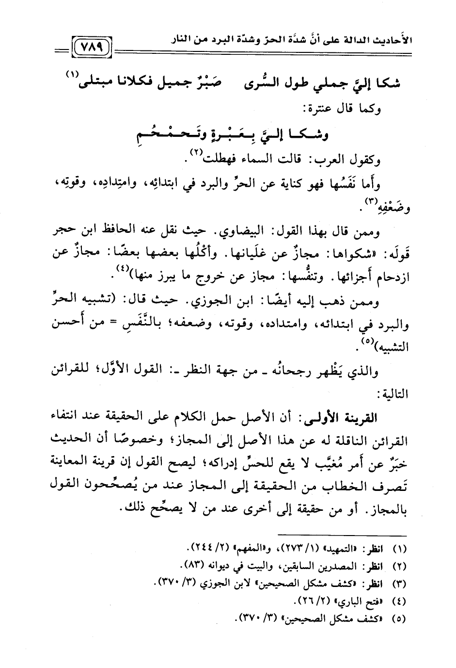 وممن قال بهذا القول: البيضاوي. حيث نقل عنه الحافظ ابن حجر قَولَه: «شكواها: مجازٌ عن غلَيانها. وأكْلُها بعضها بعضًا: مجازٌ عن ازدحام أَجزائها. وتنفُّسها: مجاز عن خروج ما يبرز منها) (¬٤) .